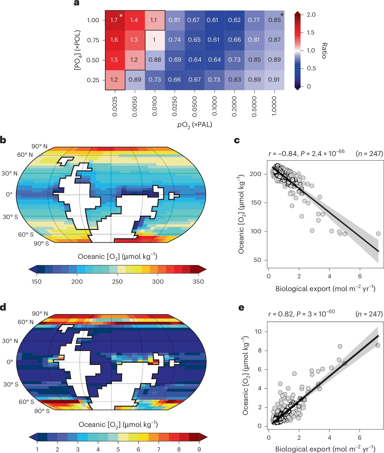 图3 地球系统模型中海洋上层水体氧气含量的空间分布及其与生产力的相关关系,b-c)pO2=1 PAL,d-e)pO2=0.0025 PAL