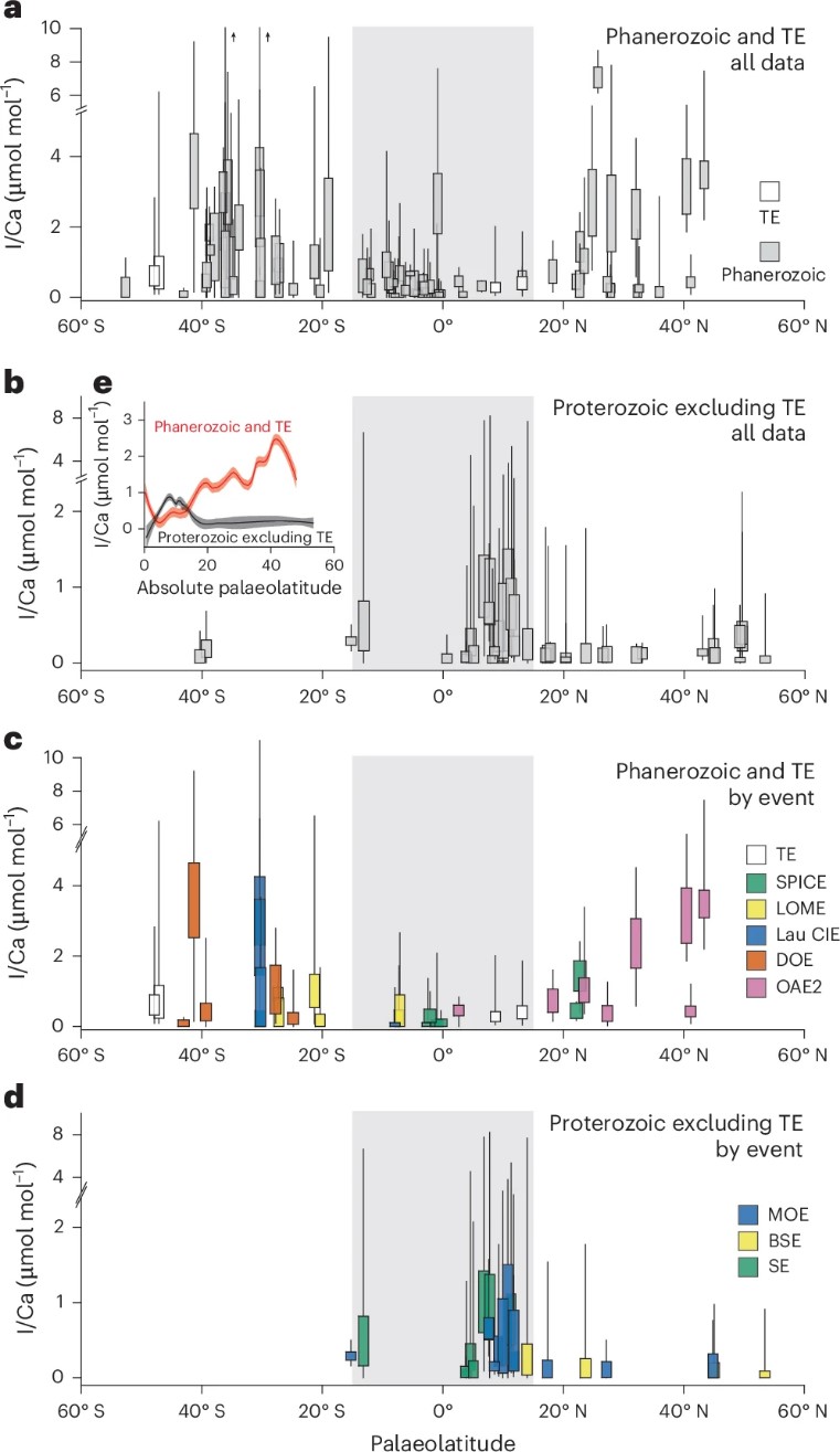 现代海洋上层水体的氧气含量具有显著的纬度梯度,氧气由中高纬度向赤道附近递减,原因包括:温度对氧气溶解度的控制、低纬度大陆边缘易发育缺氧水体(OMZ)。氧气的纬度梯度影响了碘元素的氧化还原过程,海水中氧化态的碘酸根离子(IO3−)也呈现出由中高纬度向赤道降低的趋势,现生浮游有孔虫壳体的I/Ca比值(氧化还原指标)也具有类似的纬度梯度。因此, I/Ca指标可以记录地质历史时期海洋氧气含量的纬度梯度。