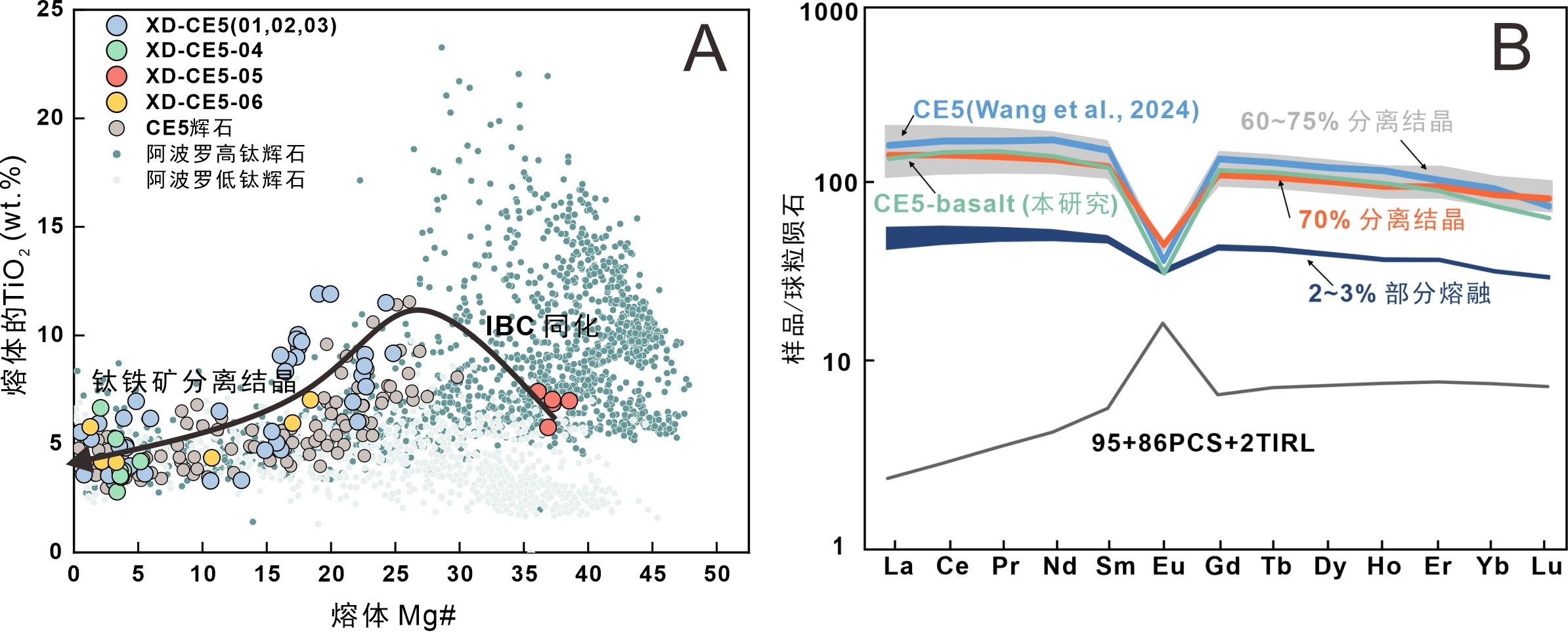 嫦娥五号着陆区位于风暴洋的克里普地体(PKT),该区域玄武岩普遍富钛。研究推测,南极—艾特肯盆地的大型撞击事件,可能曾将富钛 IBC重新分配至月球近侧,使其内部更易发生熔融。上月幔中残余的钛铁矿能够降低源区熔点,从而促进岩浆产生,这也为月球近侧火山活动持续至约20亿年前提供了新的解释。