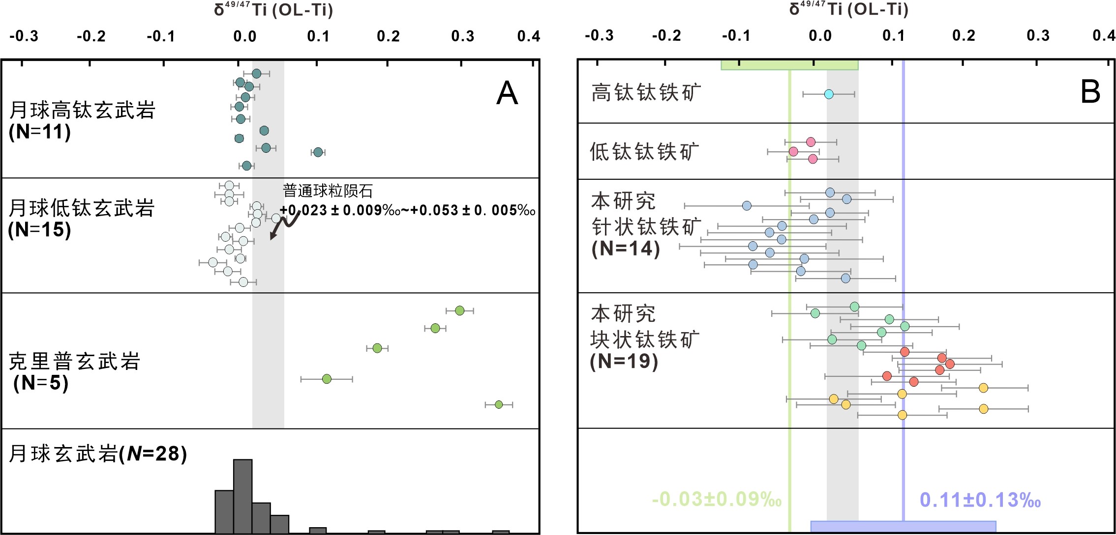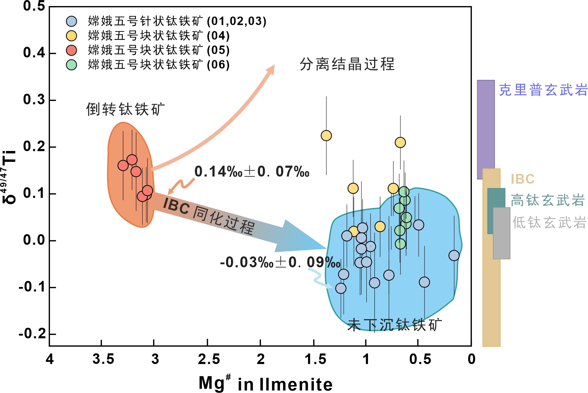 关于20亿年前形成的嫦娥五号玄武岩一个关键科学问题尚未明确:在嫦娥五号玄武岩演化过程中IBC是否参与了岩浆演化。为回答这一问题,研究团队将目光投向了对岩浆演化过程极为敏感的“示踪剂”——钛同位素。由于钛铁矿更倾向富集轻钛同位素,其分离结晶有望在月球玄武岩中留下可识别的同位素信号。随着高精度微区原位激光剥蚀Ti同位素分析技术的发展,使得在矿物尺度上分析同位素变化成为可能。