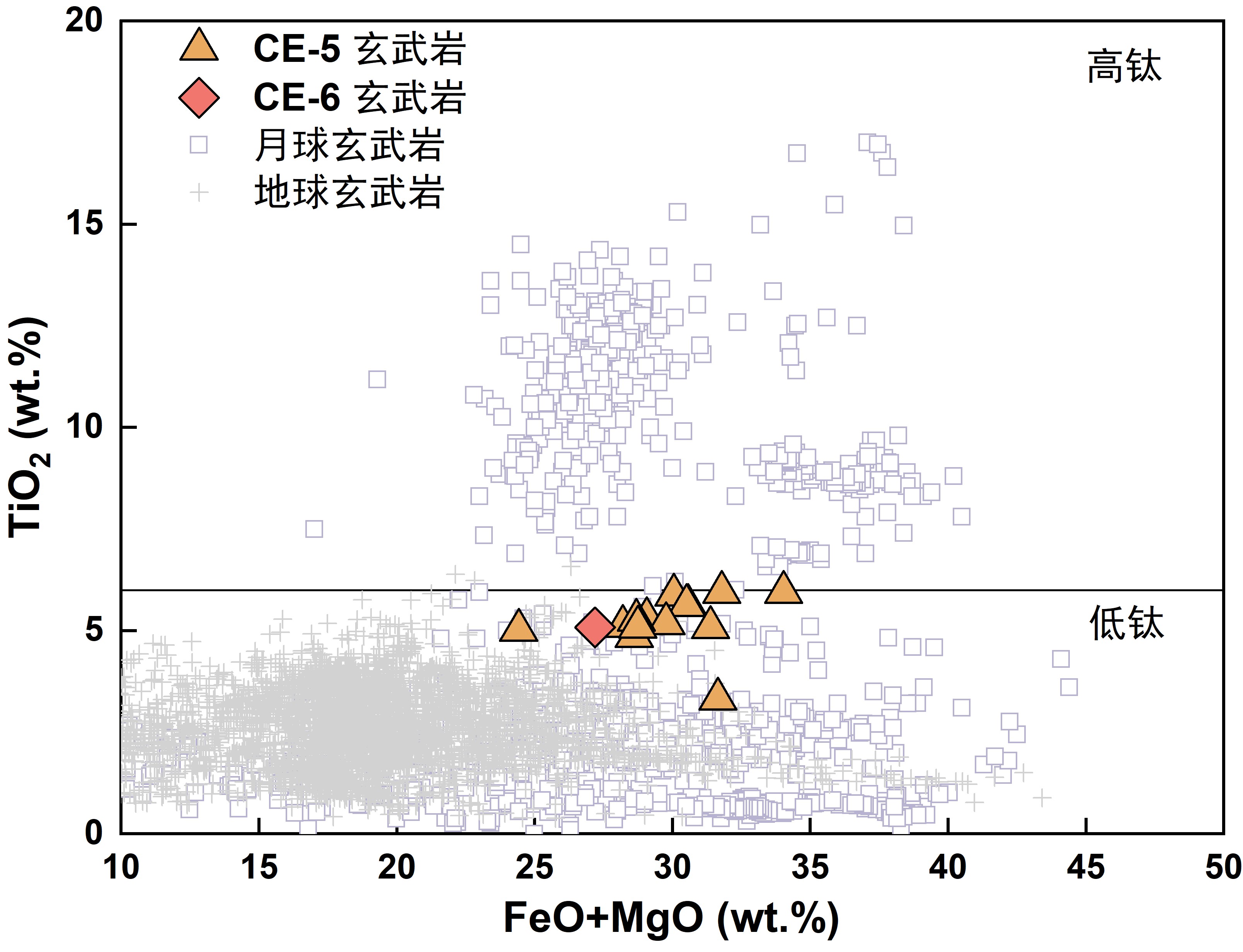 玄武岩是火山喷发形成的岩石,也是研究行星内部结构和活动的“窗口”。与地球玄武岩相比,月球玄武岩有个显著特点——钛含量变化极大,从不到1% wt.%,到超过15% wt.%,反映出月幔存在显著的化学组成不均一性。通常据此将其分为“低钛型”和“高钛型”两类。令人关注的是,嫦娥五号(CE-5)返回的玄武岩的Ti含量介于二者之间,处于高钛与低钛玄武岩的过渡区,被认为是理解月幔演化过程的关键样品(图1)。