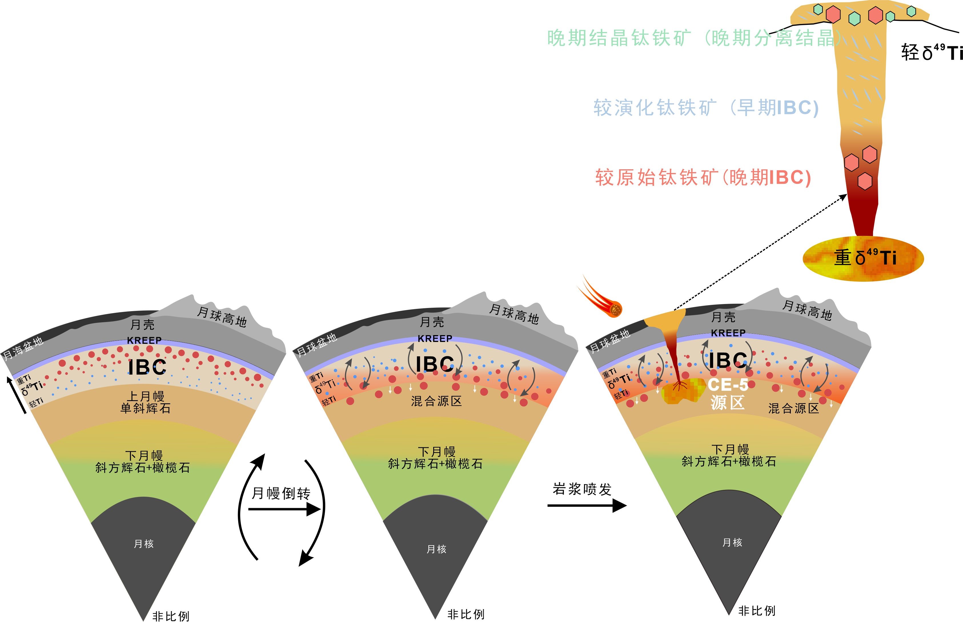 综合矿物学、地球化学与原位Ti同位素证据,研究表明嫦娥五号玄武岩的源区并不均一,而是由单斜辉石(86 PCS)和钛铁矿(95 PCS)共同组成。研究进一步指出,IBC可能存在同位素分层:晚期下沉的堆晶体富集重 Ti同位素,而轻 Ti同位素组分则在后期岩浆演化过程中混入源区。月球近侧PKT区域的上月幔可能仍保存部分未下沉的IBC,这为维持长期火山活动提供了重要物质基础。