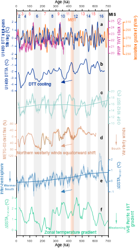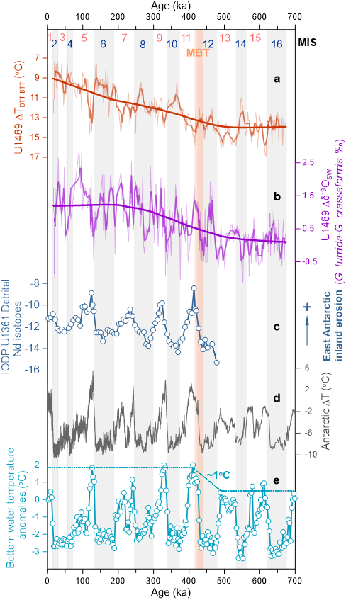 然而,驱动中布容转型的机制,长期以来是古气候学的一个难题。针对该气候转型,传统研究多关注深海大洋环流重组、海洋生物碳泵效率、海洋-大气碳循环等过程,但截至目前并未充分解答“中布容转型”之后间冰期显著增暖的原因。近年的研究进展表明:海洋内部热量在十年际、轨道尺度乃至百万年尺度上都可以发生显著变化,并直接产生气候效应。尤其是上层海洋,与大气互动最密切、对全球变暖响应,通过大洋浅层翻转环流调控着跨半球的热量传输。然而,类似“中布容转型”这样的古气候演变重大事件中,海洋内部的热量如何重新组织,仍然鲜有深入研究。