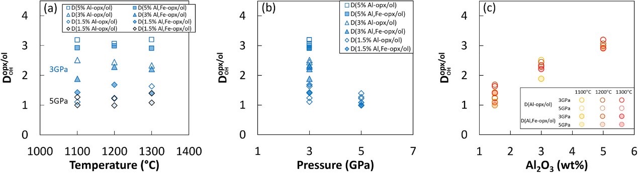 高温高压实验初始物中的橄榄石来自San Carlos橄榄岩,斜方辉石为1.5-5wt% Al2O3的合成样品,实验条件为水饱和、P = 3–5 GPa T = 1373–1573 K。结果显示,在水饱和条件下,氢在橄榄石中的溶解度随压力和温度的升高而增加,与前人的结果相似。在Al2O3含量一定的条件下,氢在含Al2O3的斜方辉石中的溶解度也随着温度和压力的增加而增加。