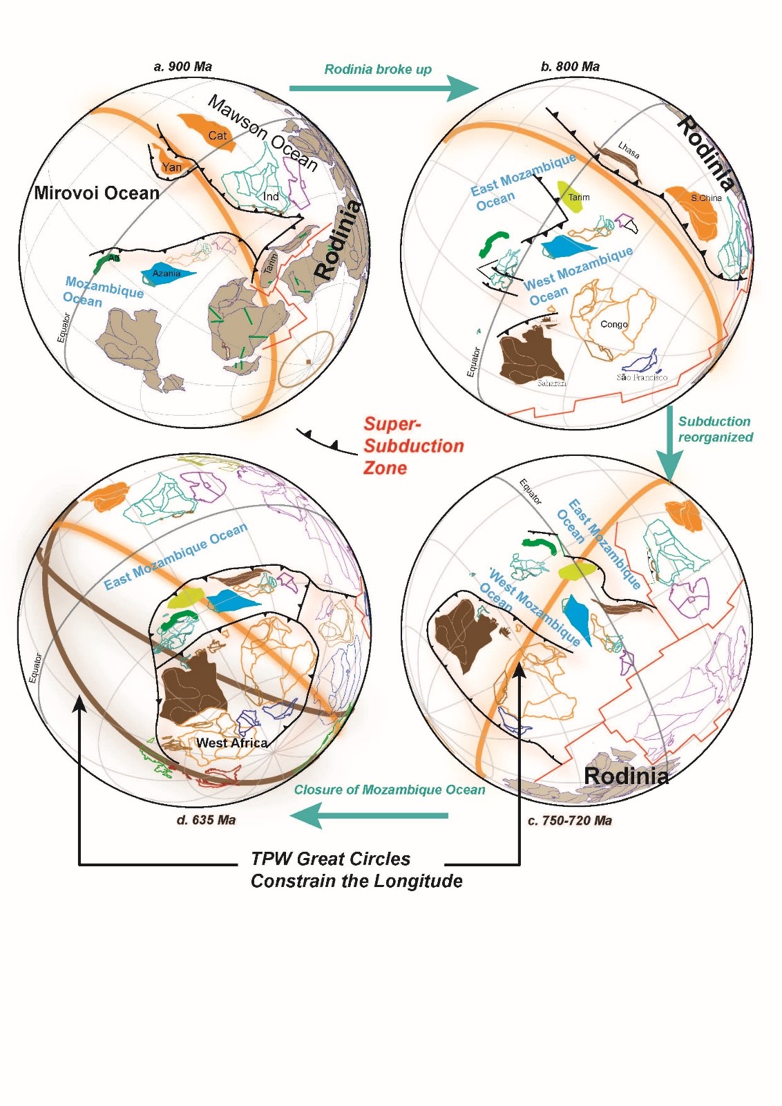 基于ANS地体俯冲带在720 Ma左右发生N–S向E–W向的转换的地质记录(Collines et al., 2021)和古地磁真极移曲线约束,研究人员将莫桑比克洋划分为西莫桑比克洋和东莫桑比克洋。在720 Ma之前,沿东莫桑比克洋TAL超级地体边缘发育N-S向的环Rodinia俯冲带,在约720 Ma,TAL超级地体边缘的俯冲带经历从N–S向E–W向的转换,导致西莫桑比克洋的关闭和东莫桑比克洋的扩展;在635 Ma之后,华南-印度陆块的南向拼合导致了东莫桑比克洋的关闭(图1 b-d)。揭示了莫桑比克洋的关闭及发育均位于Rodinia超大陆中心约90 º范围的地幔下沉带上(图1中黄色和棕色大圆弧指示区域),反映了从Rodinia到Gondwana转变的orthoversion演化过程。
