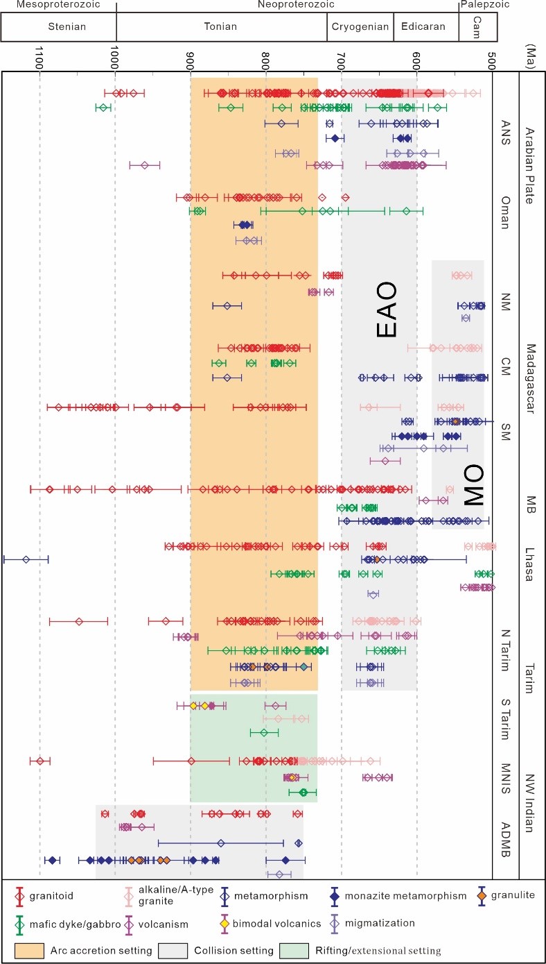 Cam, Cambrian; ANS, Arabian–Nubian Shield; MB, Mozambique belt; NM, Northern Madagascar; CM, central Madagascar; SM, Southern Madagascar; MNIS, Malani–Nagar igneous rocks; ADMB, Aravalli-Delhi mobile belt. EAO, East African Orogen; MO, Malagasy Orogen.