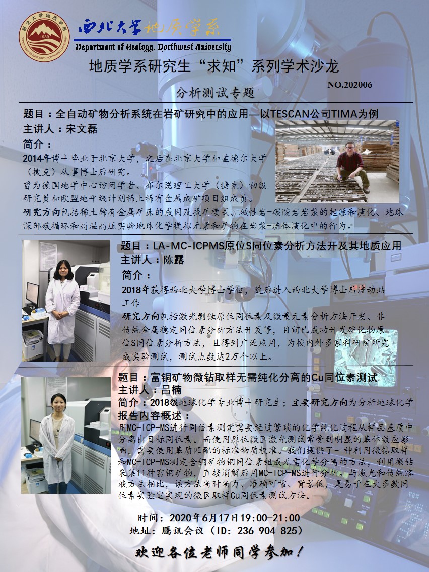 全自动矿物分析系统在岩矿研究中的应用—以TESCAN公司TIMA为例;LA-MC-ICPMS原位S同位素分析方法开及其地质应用;富铜矿物微钻取样无需纯化分离的Cu同位素测试