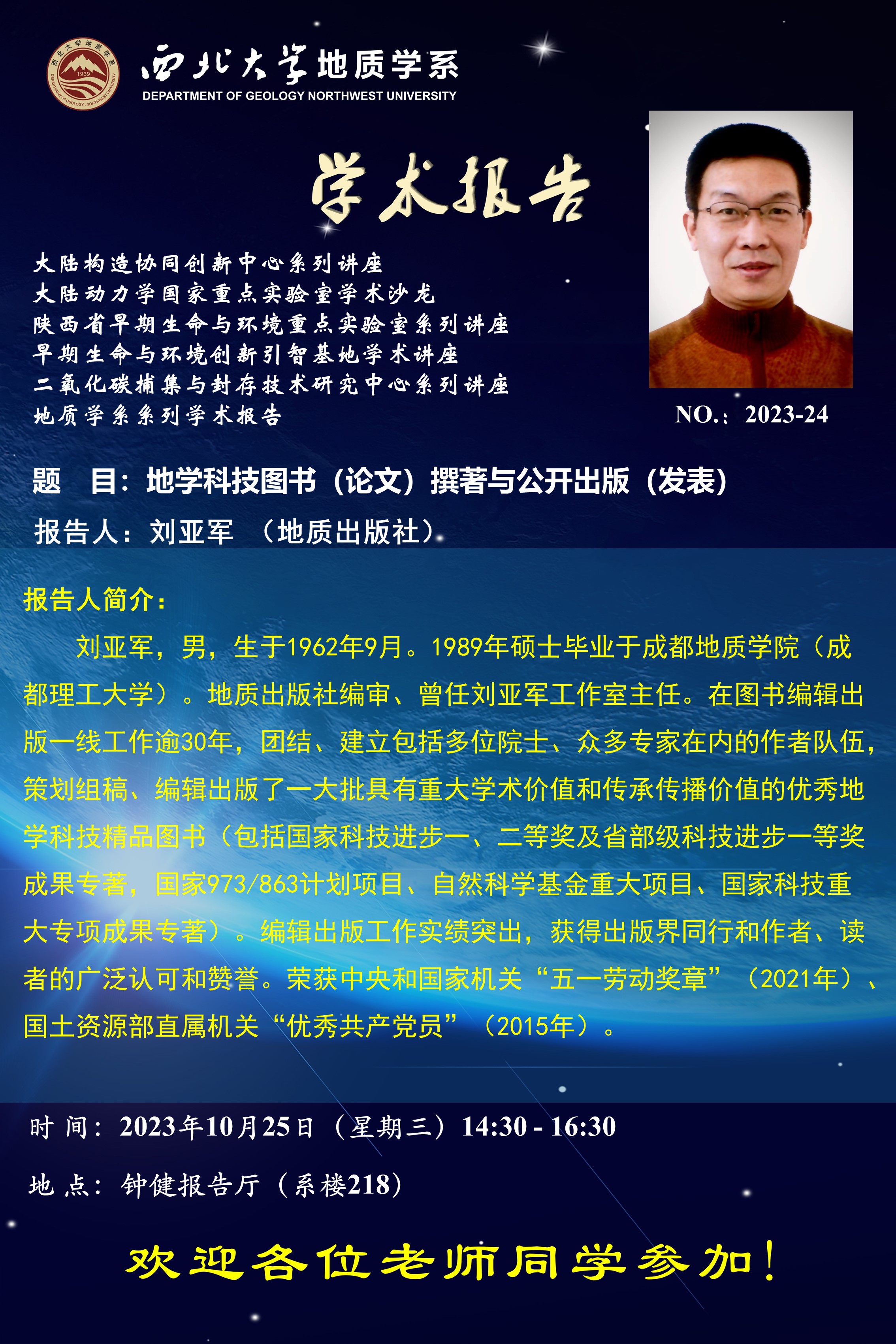 刘亚军,男,生于1962年9月。1989年硕士毕业于成都地质学院(成都理工大学)。地质出版社编审、曾任刘亚军工作室主任。在图书编辑出版一线工作逾30年,团结、建立包括多位院士、众多专家在内的作者队伍策划组稿、编辑出版了一大批具有重大学术价值和传承传播价值的优秀地学科技精品图书(包括国家科技进步一、二等奖及省部级科技进步一等奖成果专著,国家973/863计划项目、自然科学基金重大项目、国家科技重大专项成果专著)。编辑出版工作实绩突出,获得出版界同行和作者、读者的广泛认可和赞誉。荣获中央和国家机关“五一劳动奖章”(2021年)、国土资源部直属机关“优秀共产党员”(2015年)。
