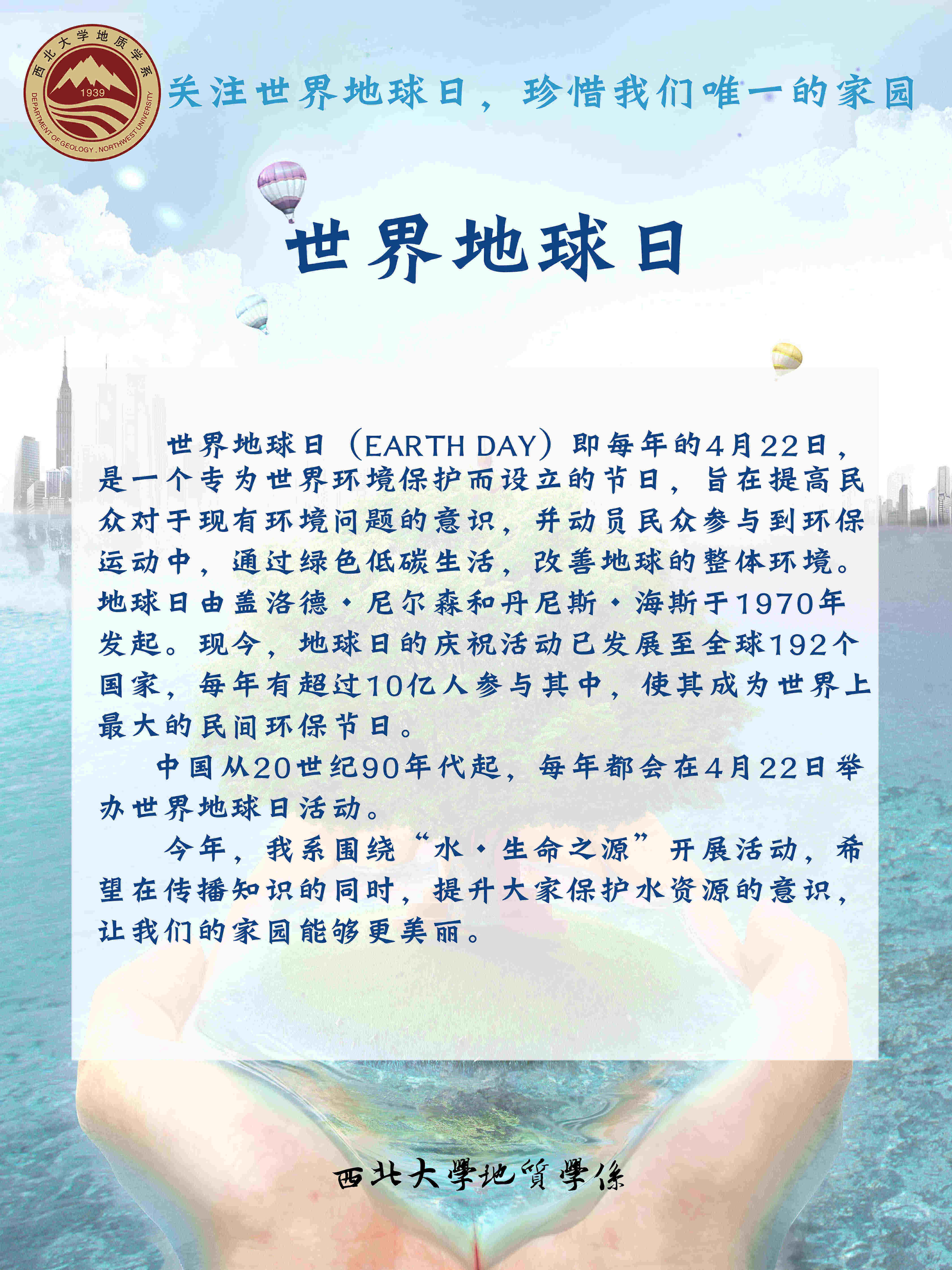 2017422日是第48个世界地球日,地质学系以“水”为核心,成功举办“水—生命之源”主题活动。