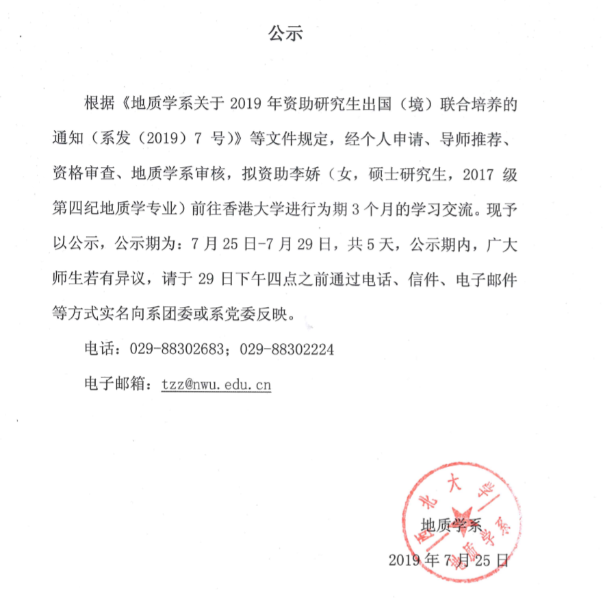 地质学系关于资助李娇同学出国事宜的公示