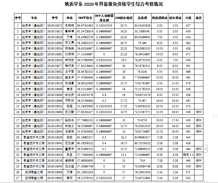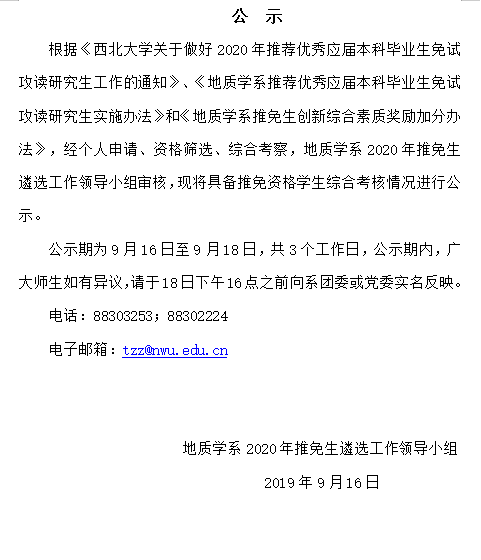 地质学系关于2020年推荐优秀应届本科毕业生免试攻读研究生遴选结果的公示