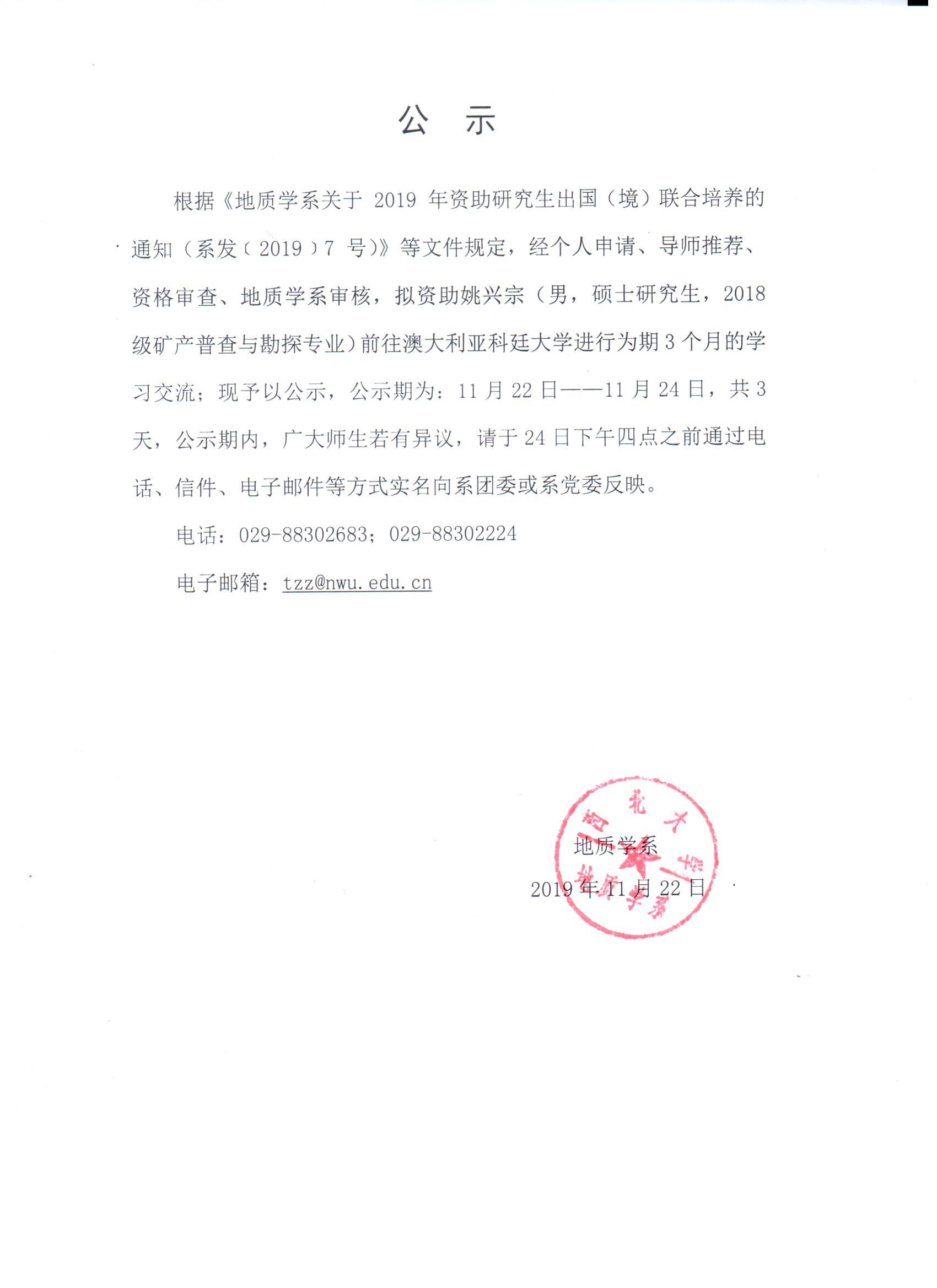 地质学系关于资助姚兴宗同学出国事宜的公示
