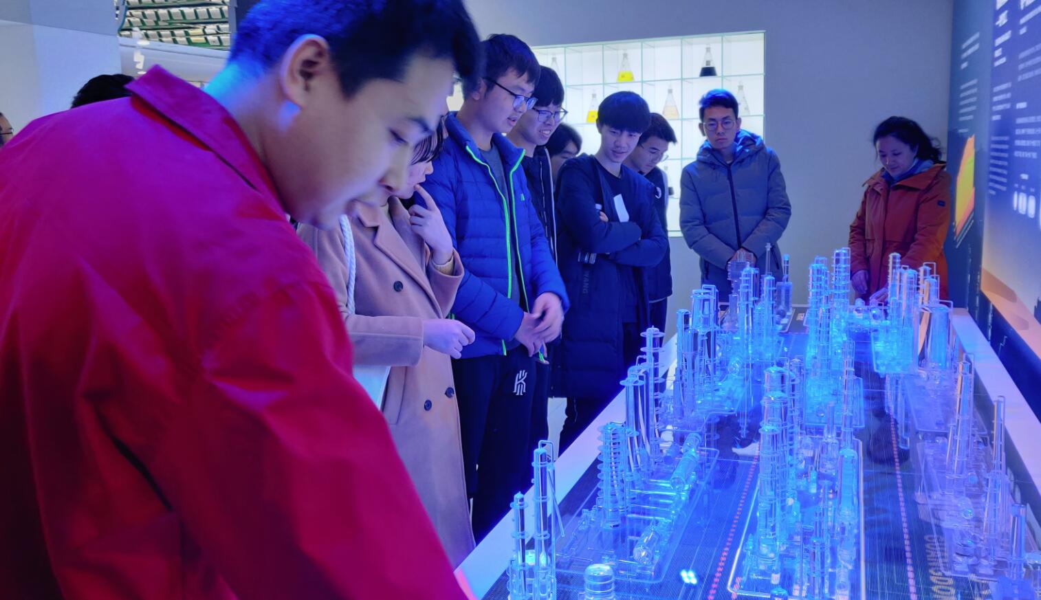 在延长石油发展史陈列馆,讲解员张坤女士首先介绍了延长石油起源、发展和壮大历程。自1905年创建"延长石油厂"、1907年打成中国陆上第一口油井、1944年毛泽东主席题词"埋头苦干"到改革开放后,坚持以油养油、采炼结合、滚动发展,延长石油逐步成长为"油气并重、油化并举,煤油气综合利用"的特色现代产业集团。上游生产模块的机械模型、动画演示和事物讲解引得同学们连连称奇,同时也对整个勘探—开发过程有了更加深入的了解。炼化单元用3D打印模型将原有炼化厂微缩到同学们面前,不同色彩的指示灯代表不同化合物的生产路线,让同学们对石油炼化有了更加深刻的认识。如科幻电影般的科研成果展示区,展示了延长石油在煤、油、气综合利用,污染防治,碳捕捉与封存等领域的最新技术,带领同学们领略最前沿科技的魅力。