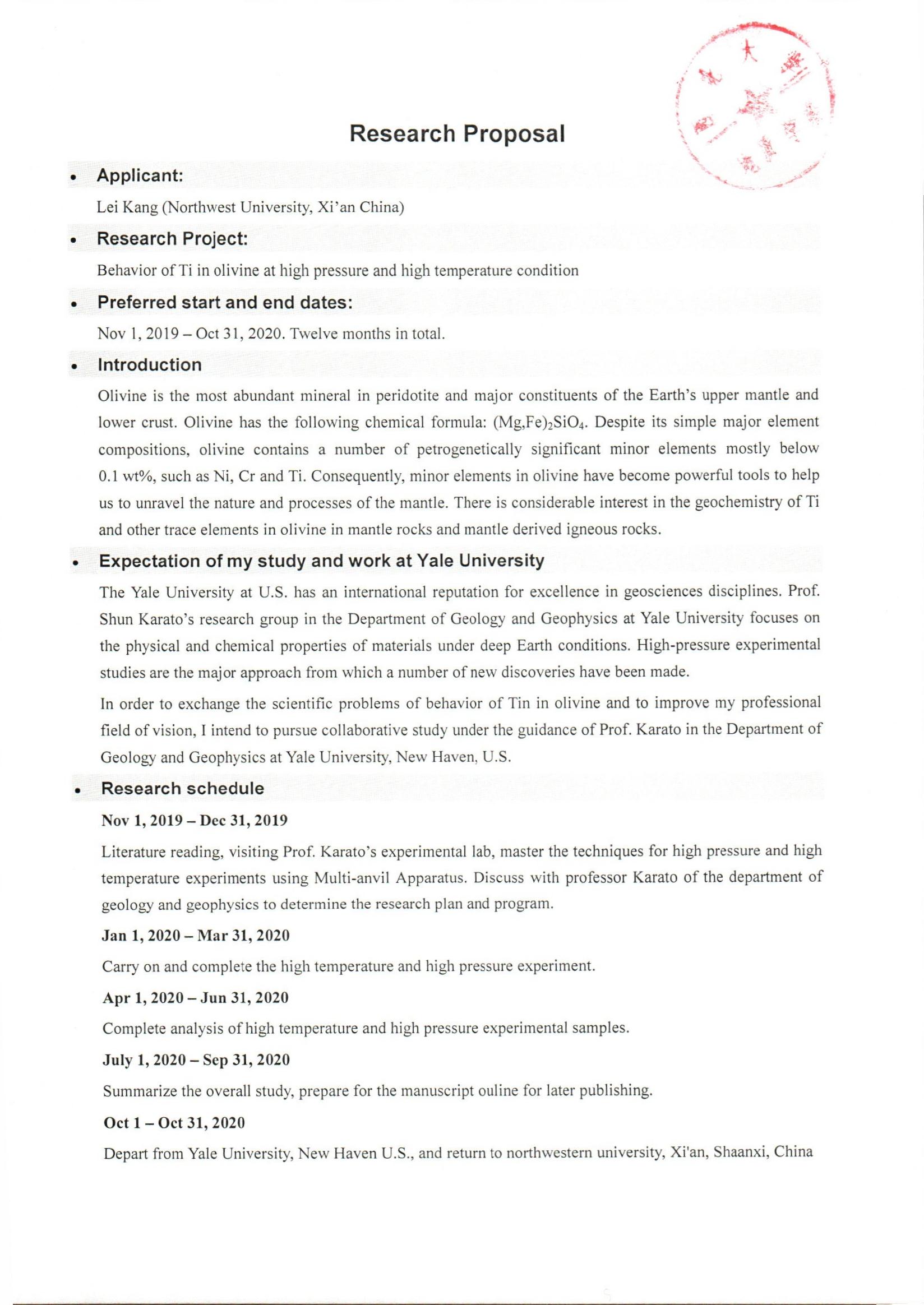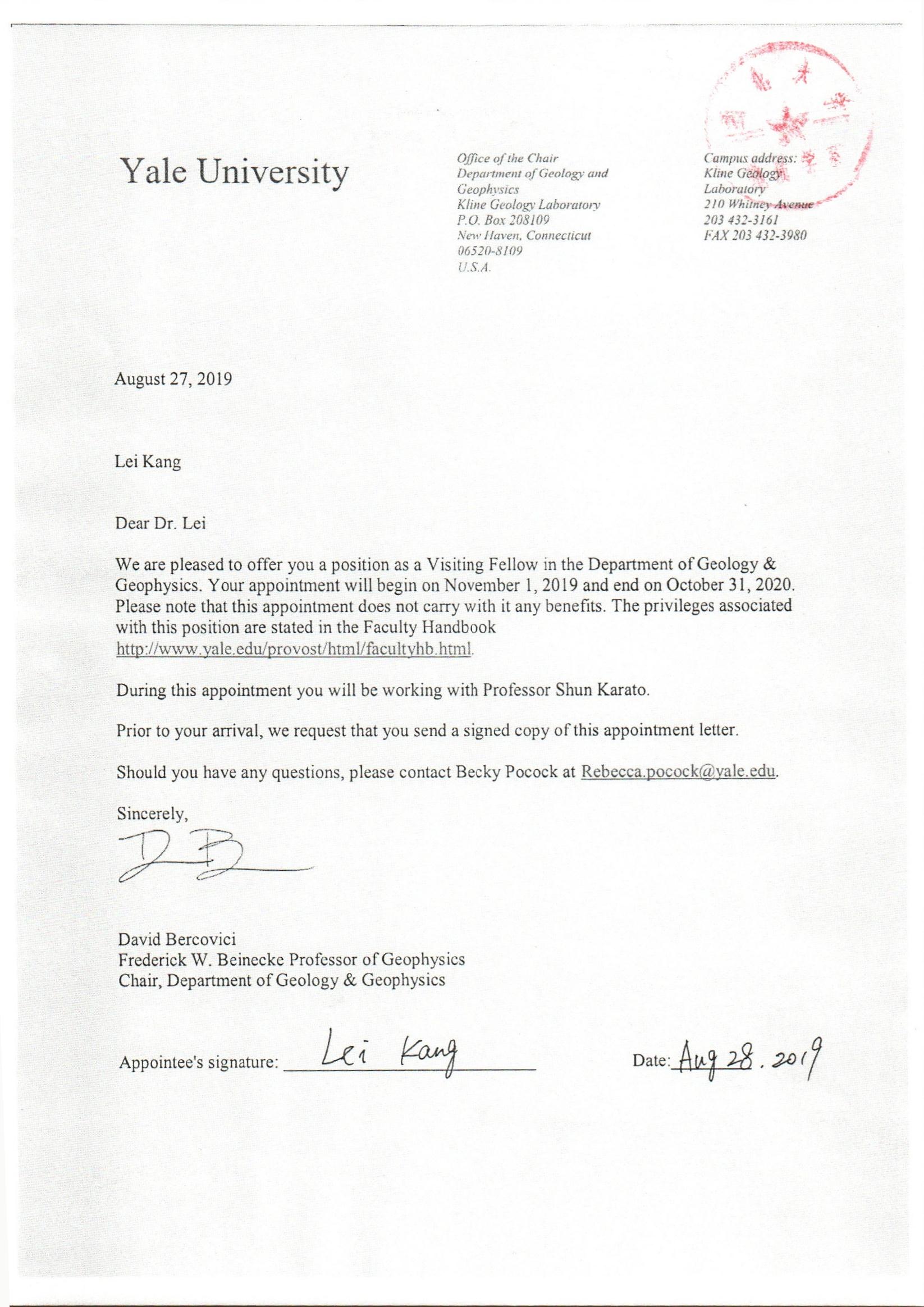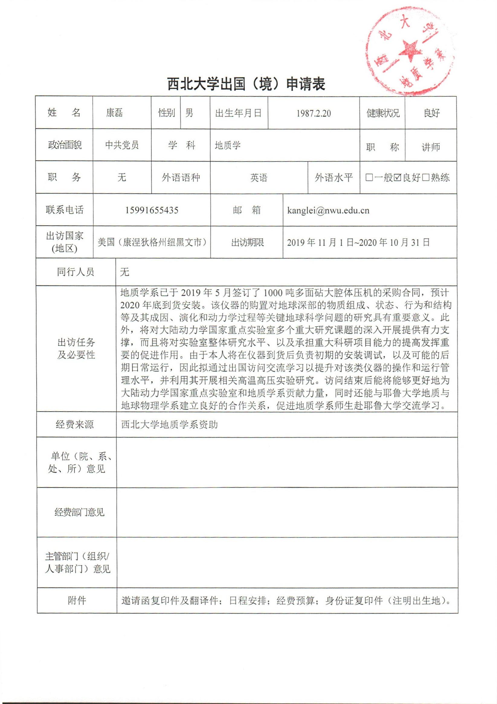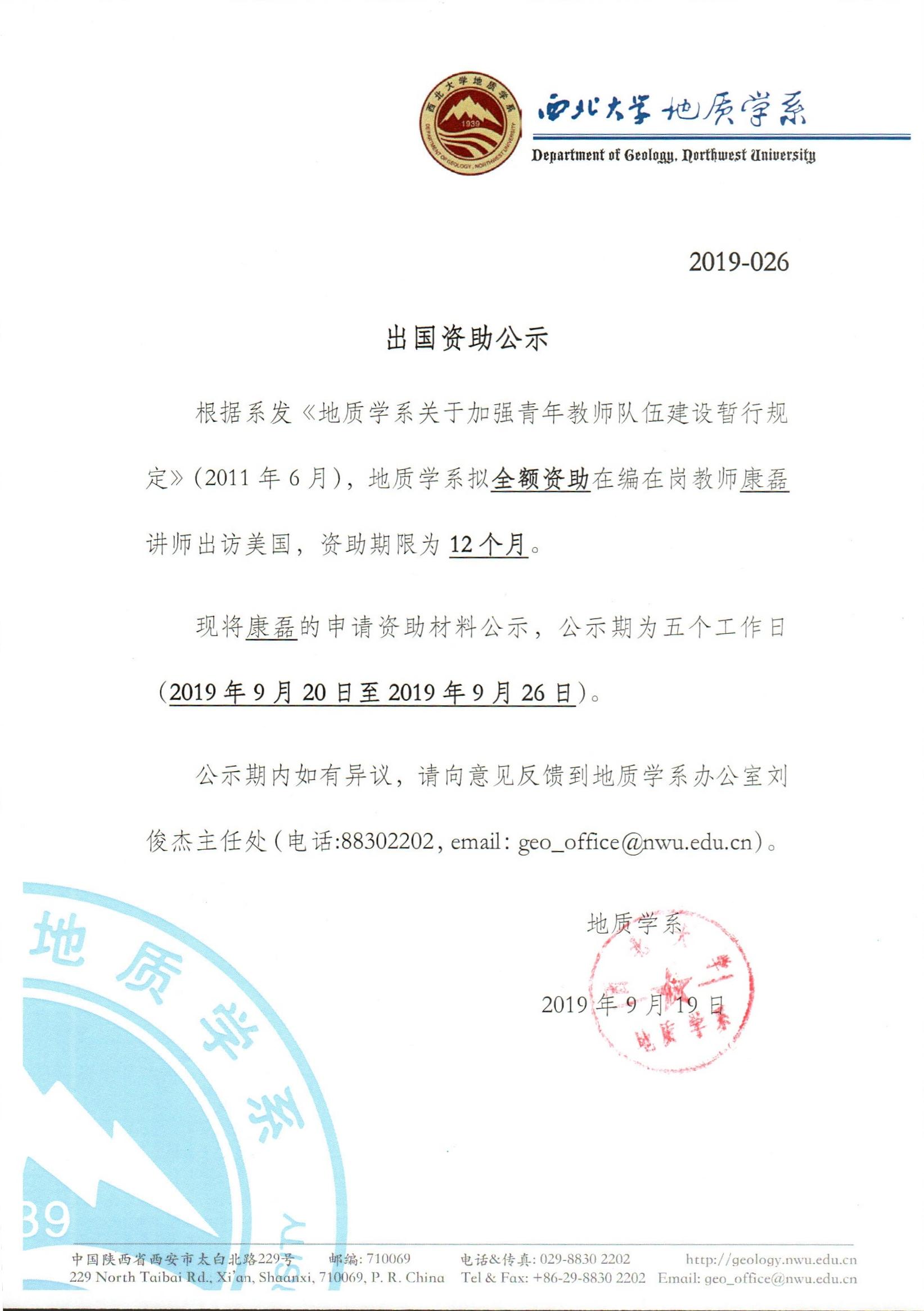 地质学系关于资助教师康磊出国学习交流的公示