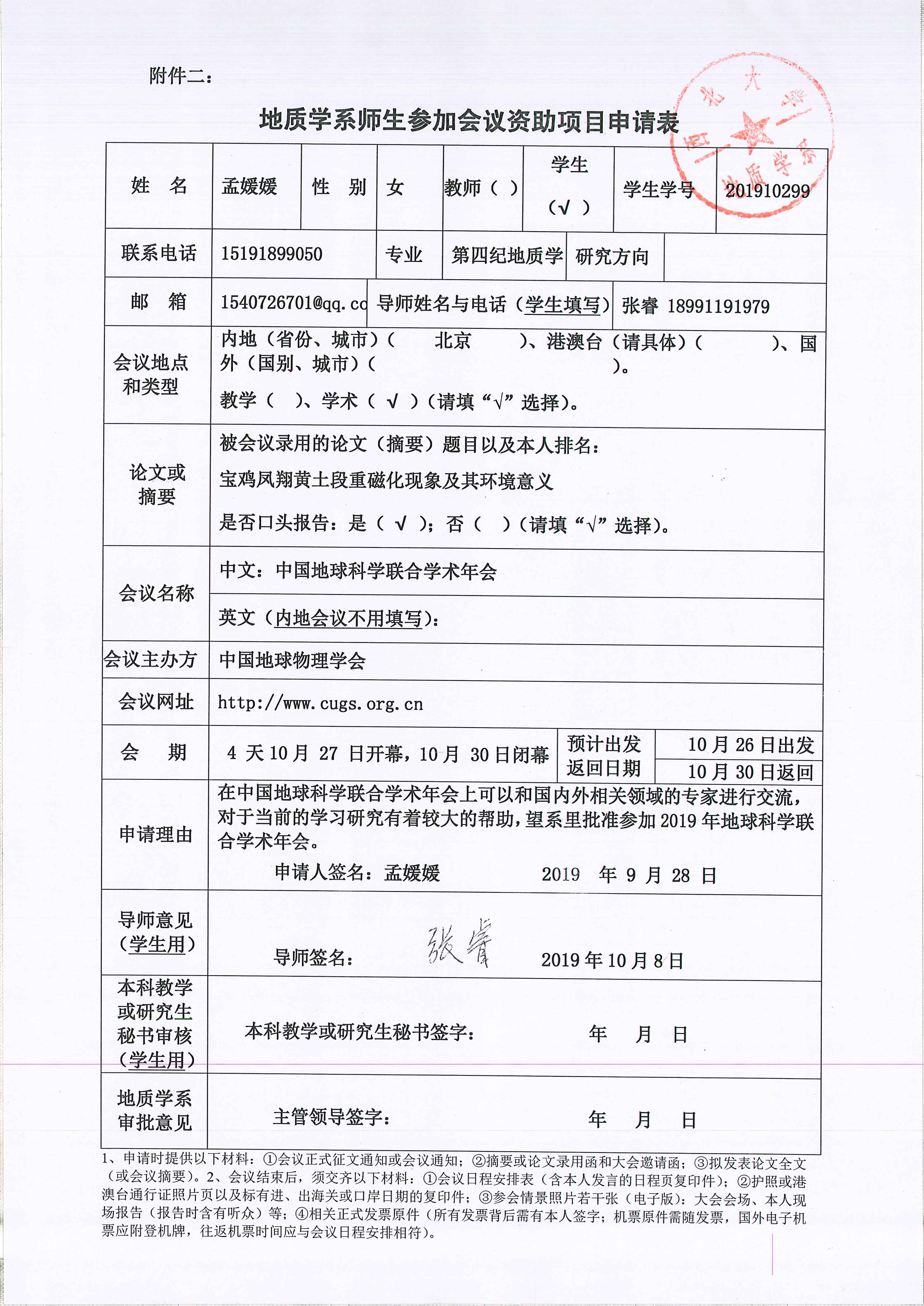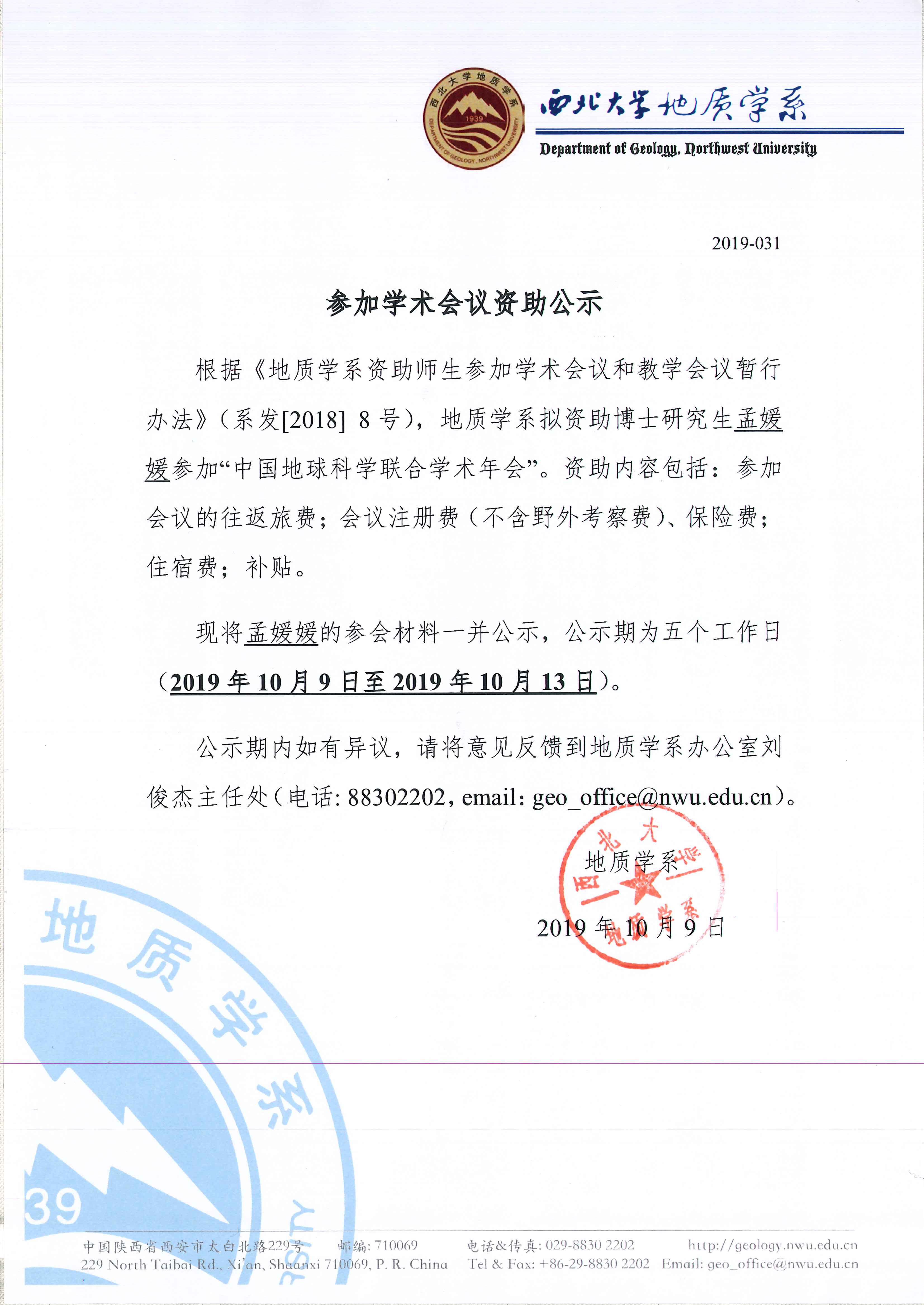 地质学系关于资助研究生孟媛媛参加学术会议的公示