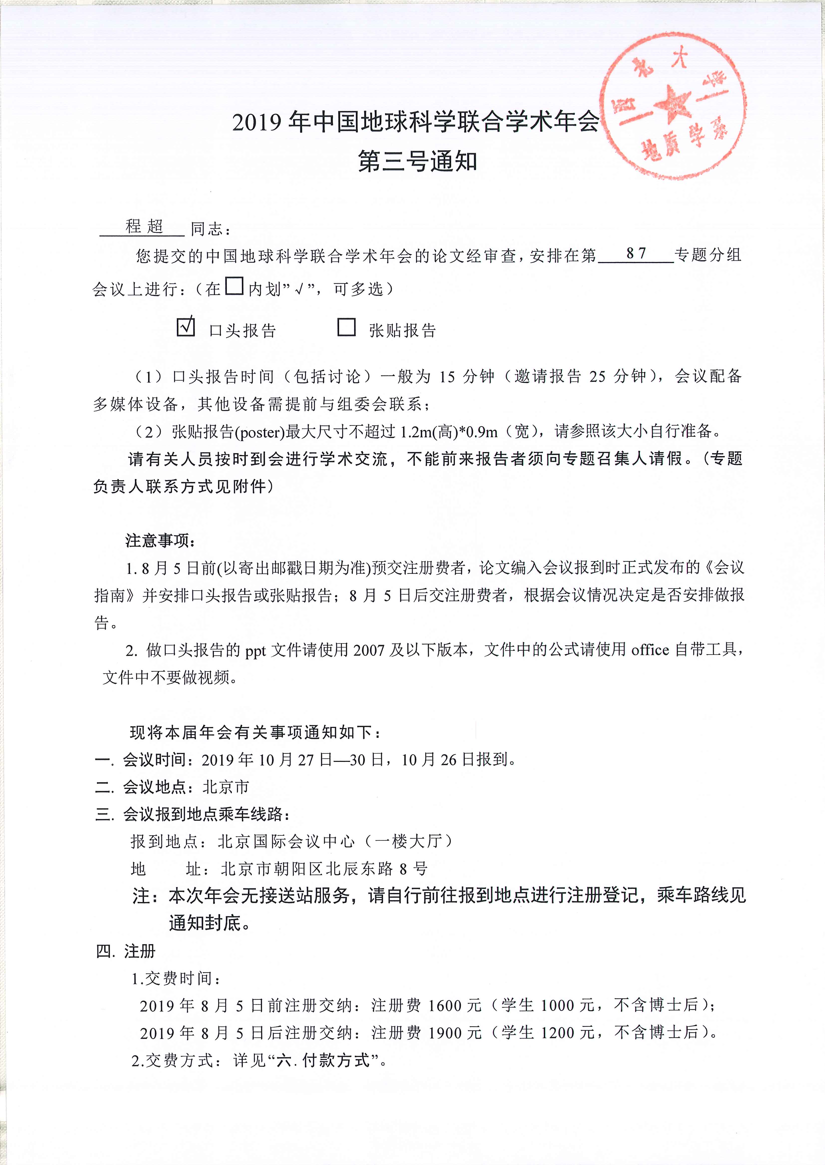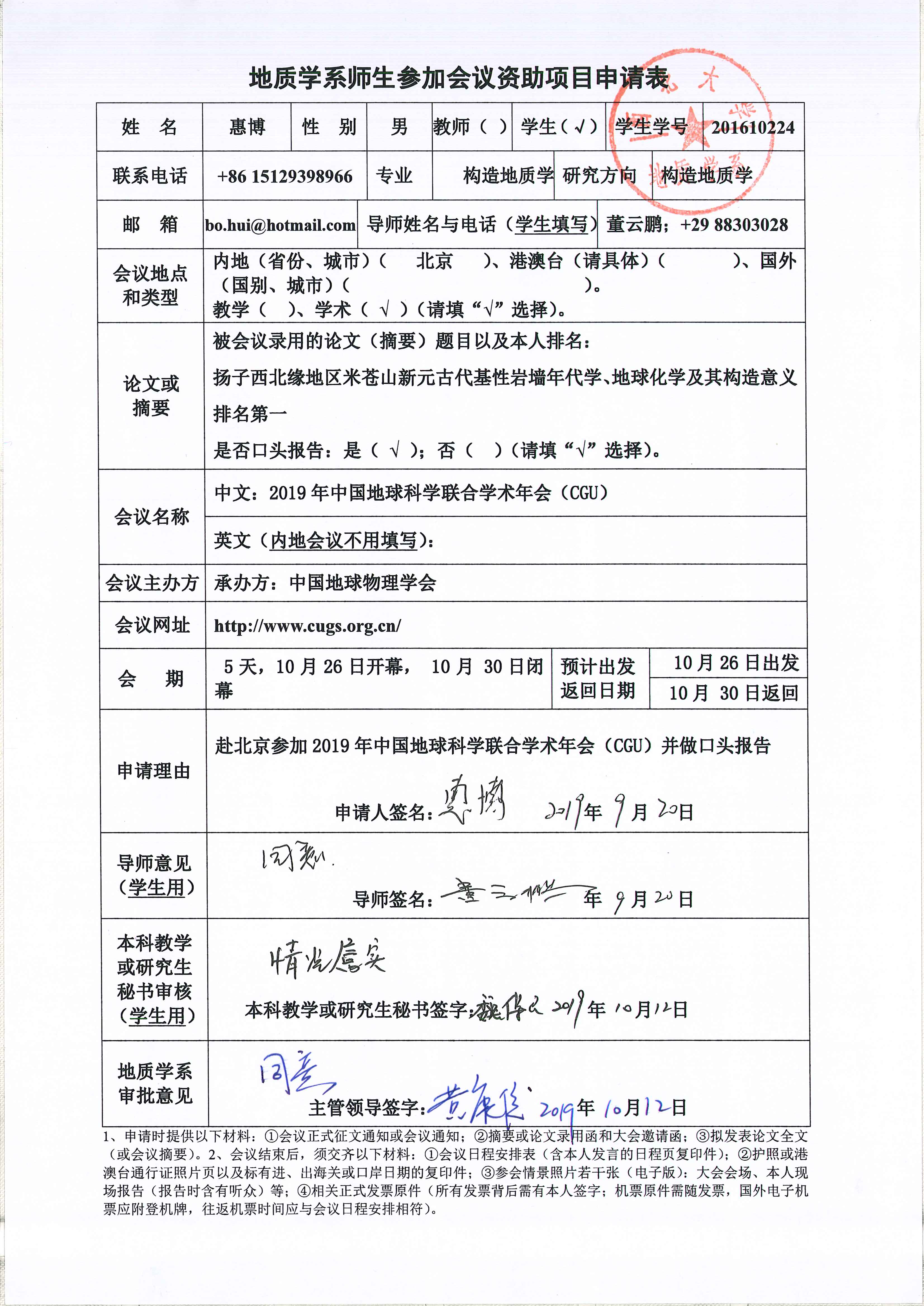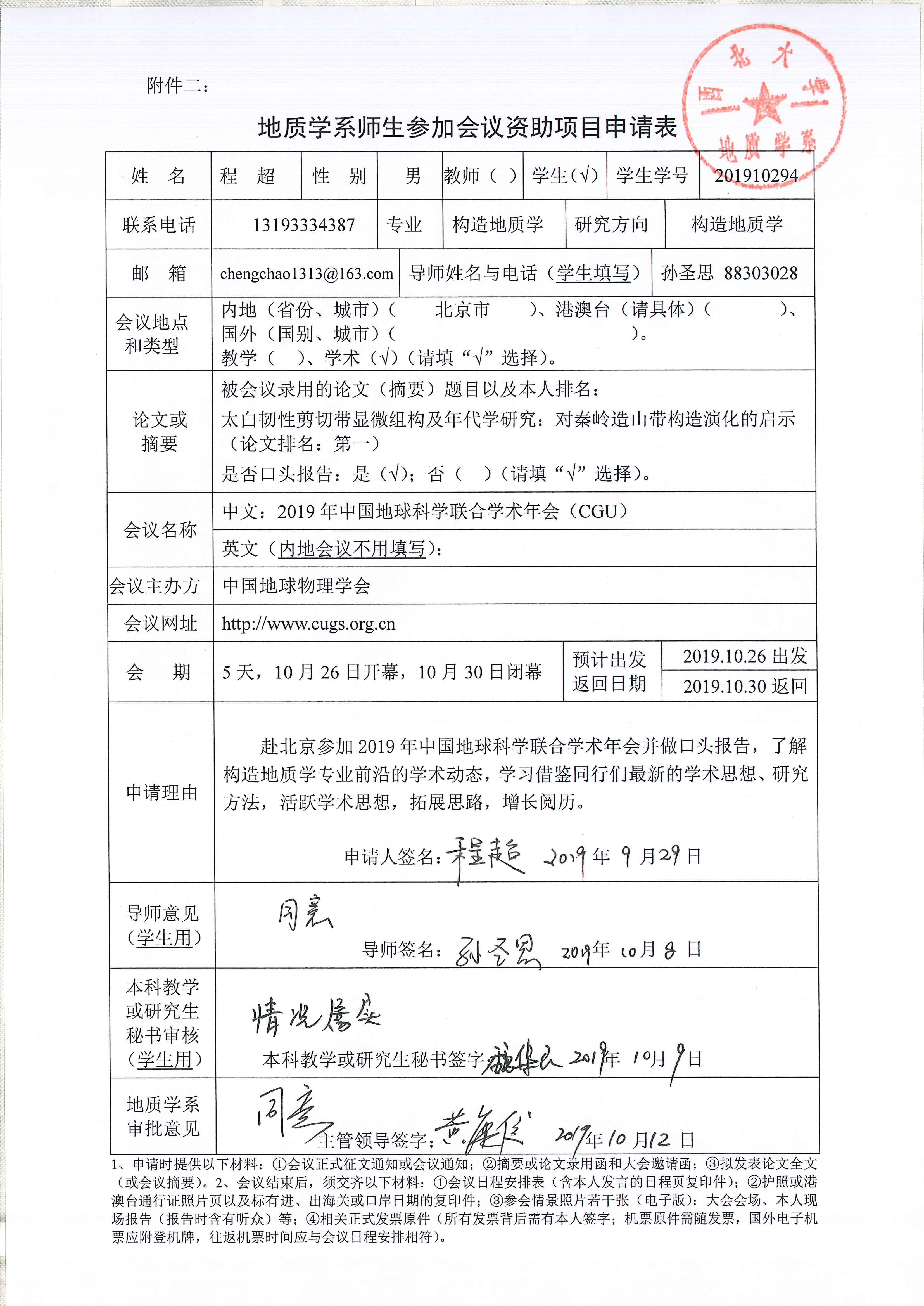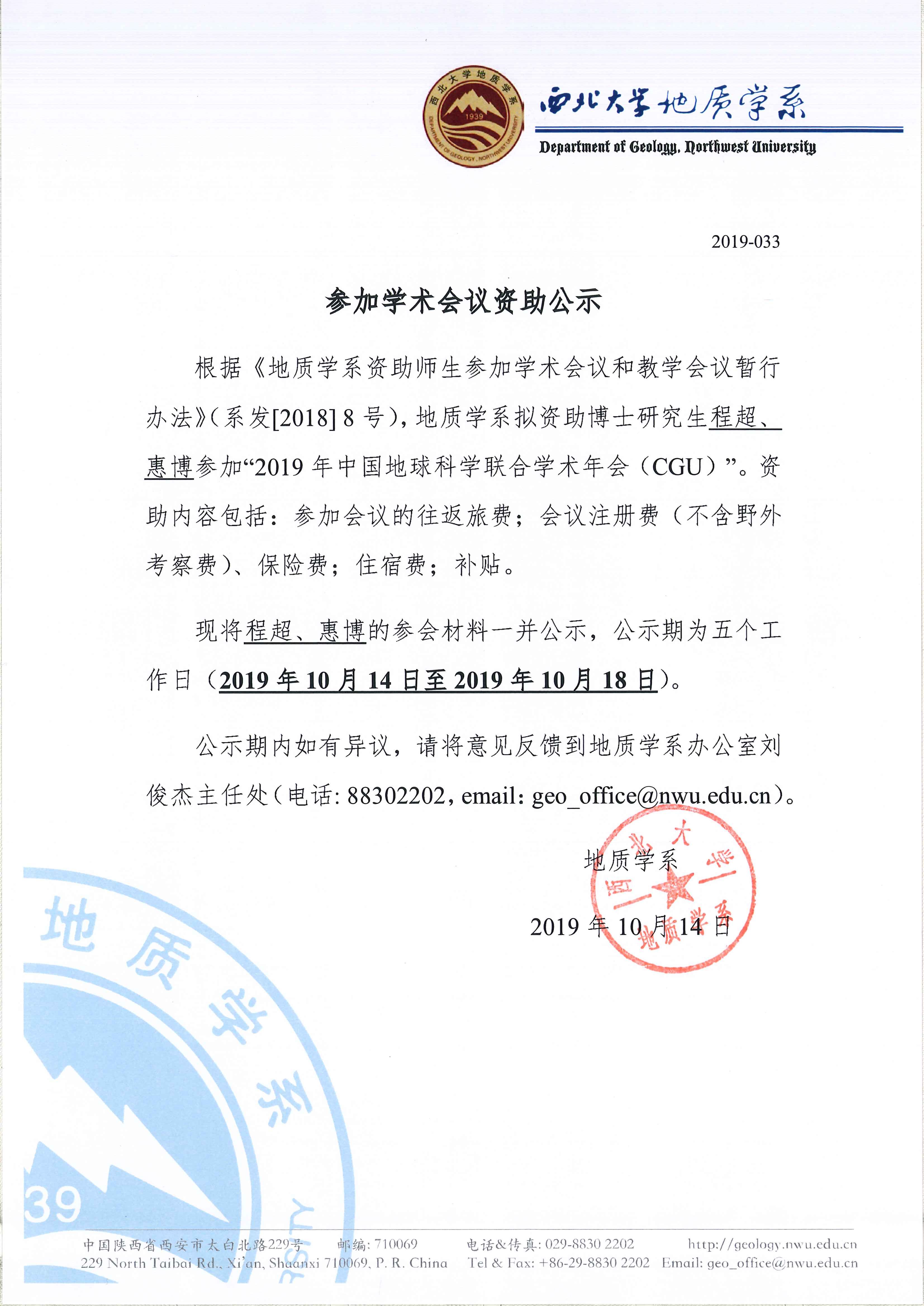 地质学系关于资助博士研究生程超、惠博参加学术会议的公示