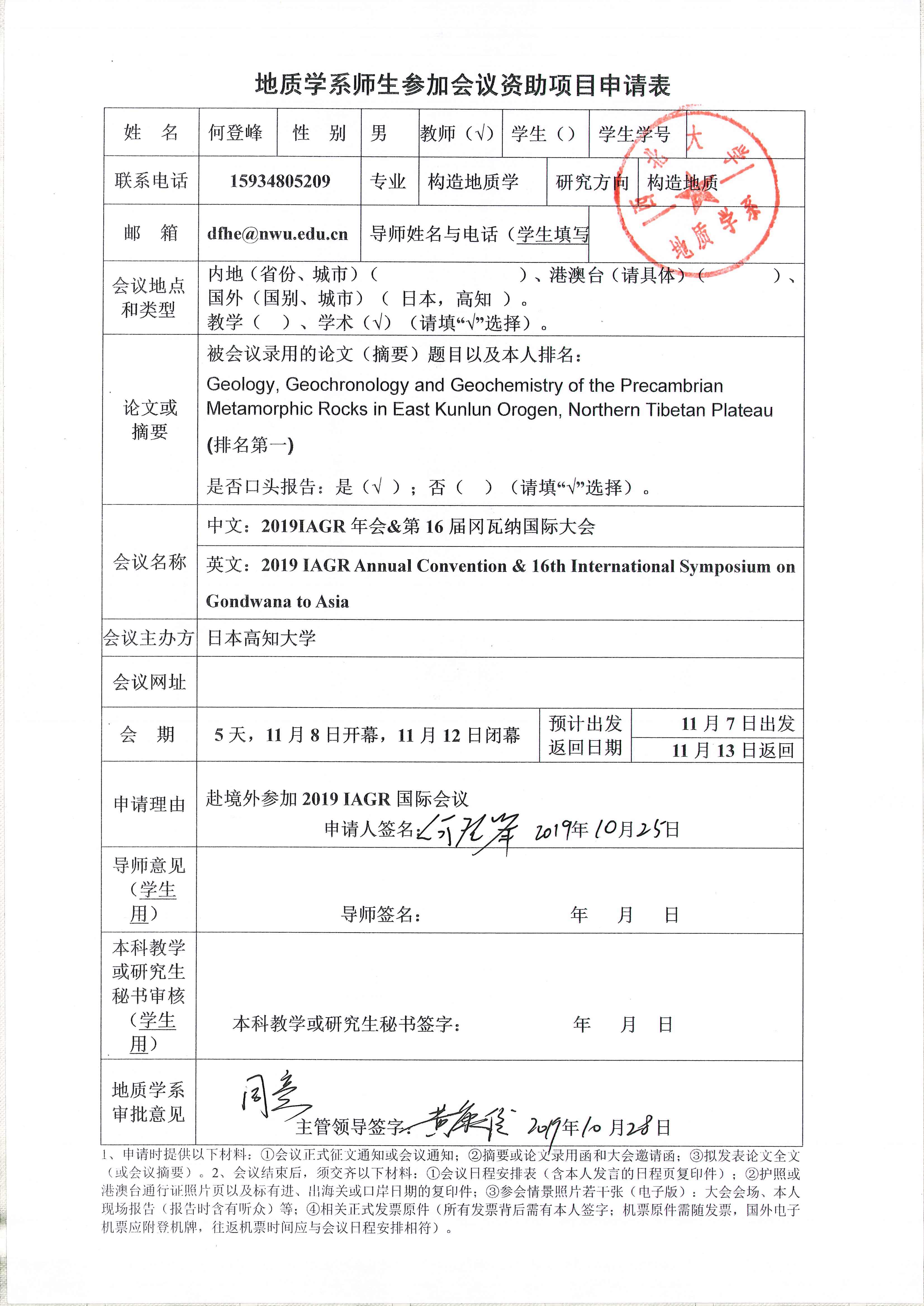 地质学系关于资助教师何登峰出国参加学术会议的公示