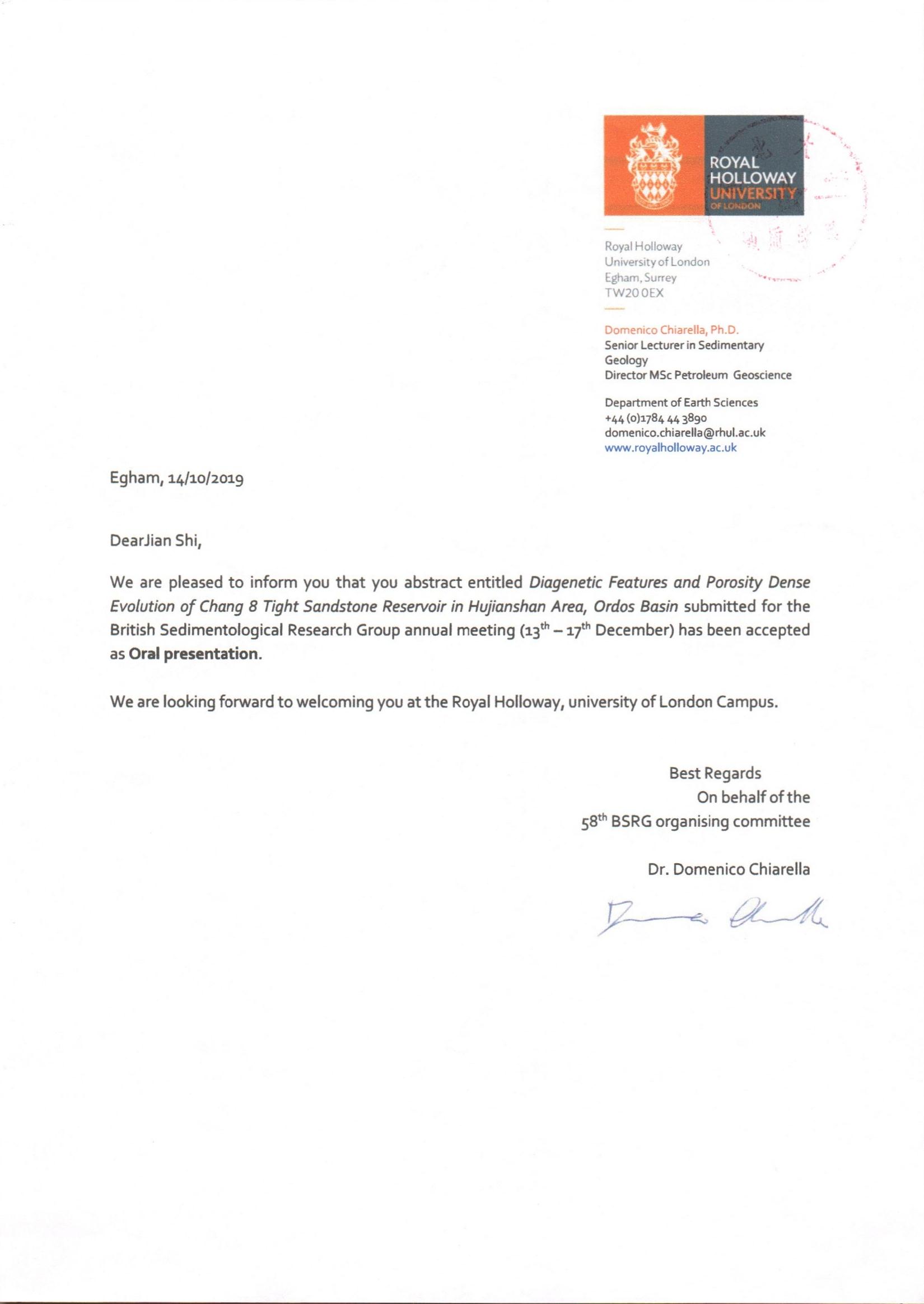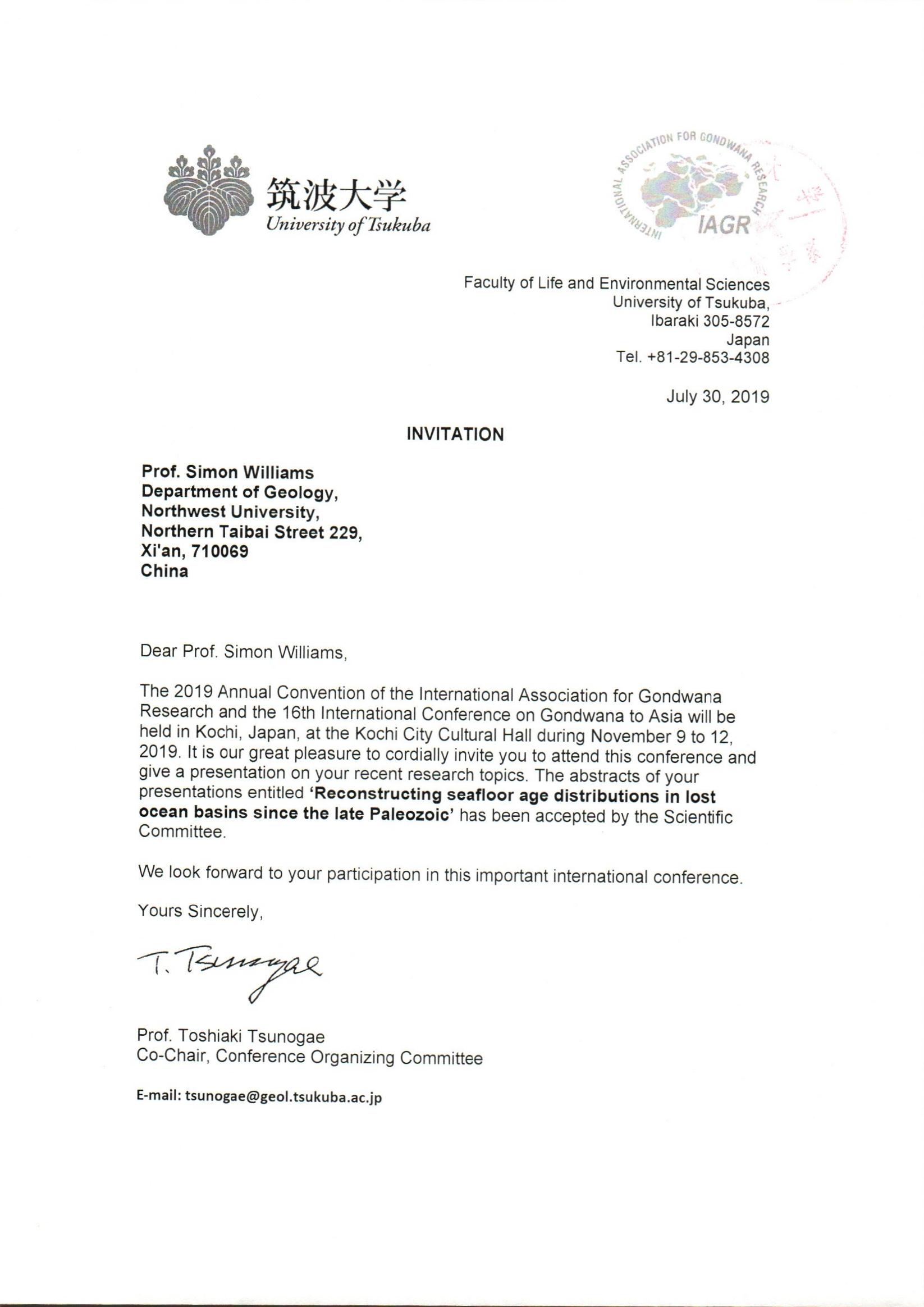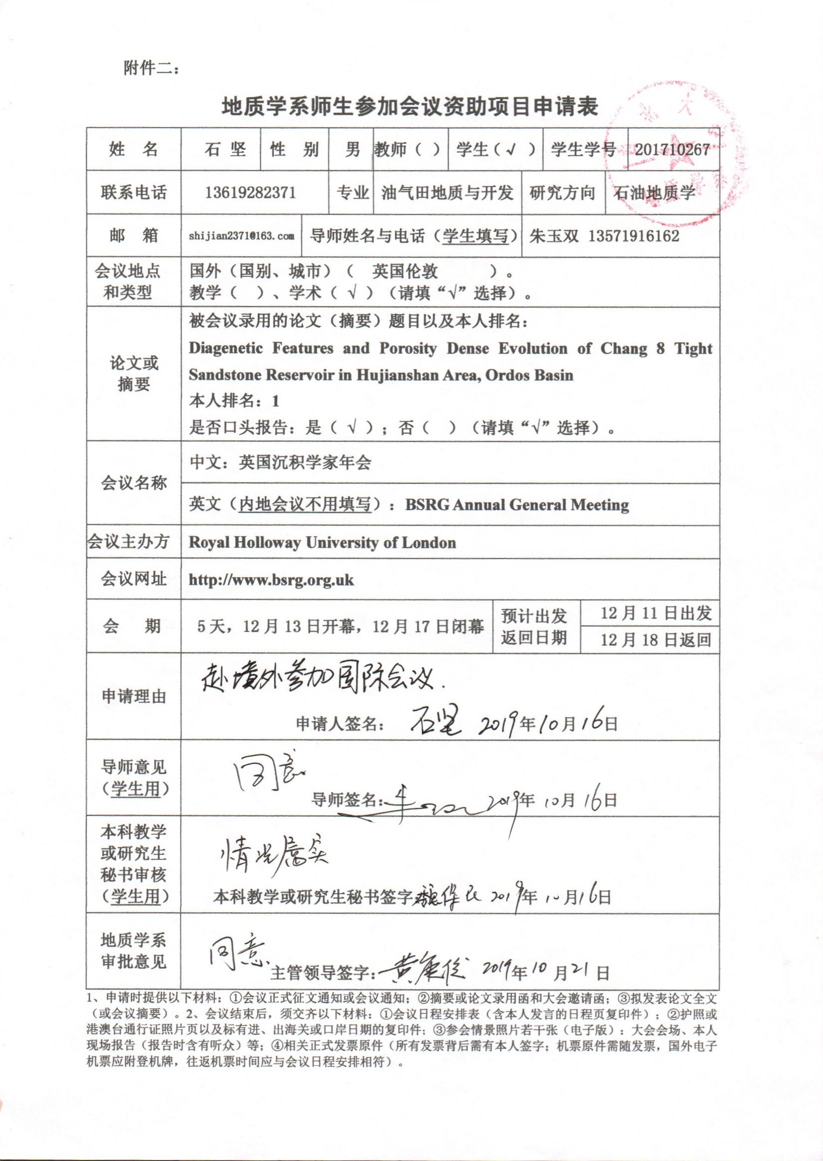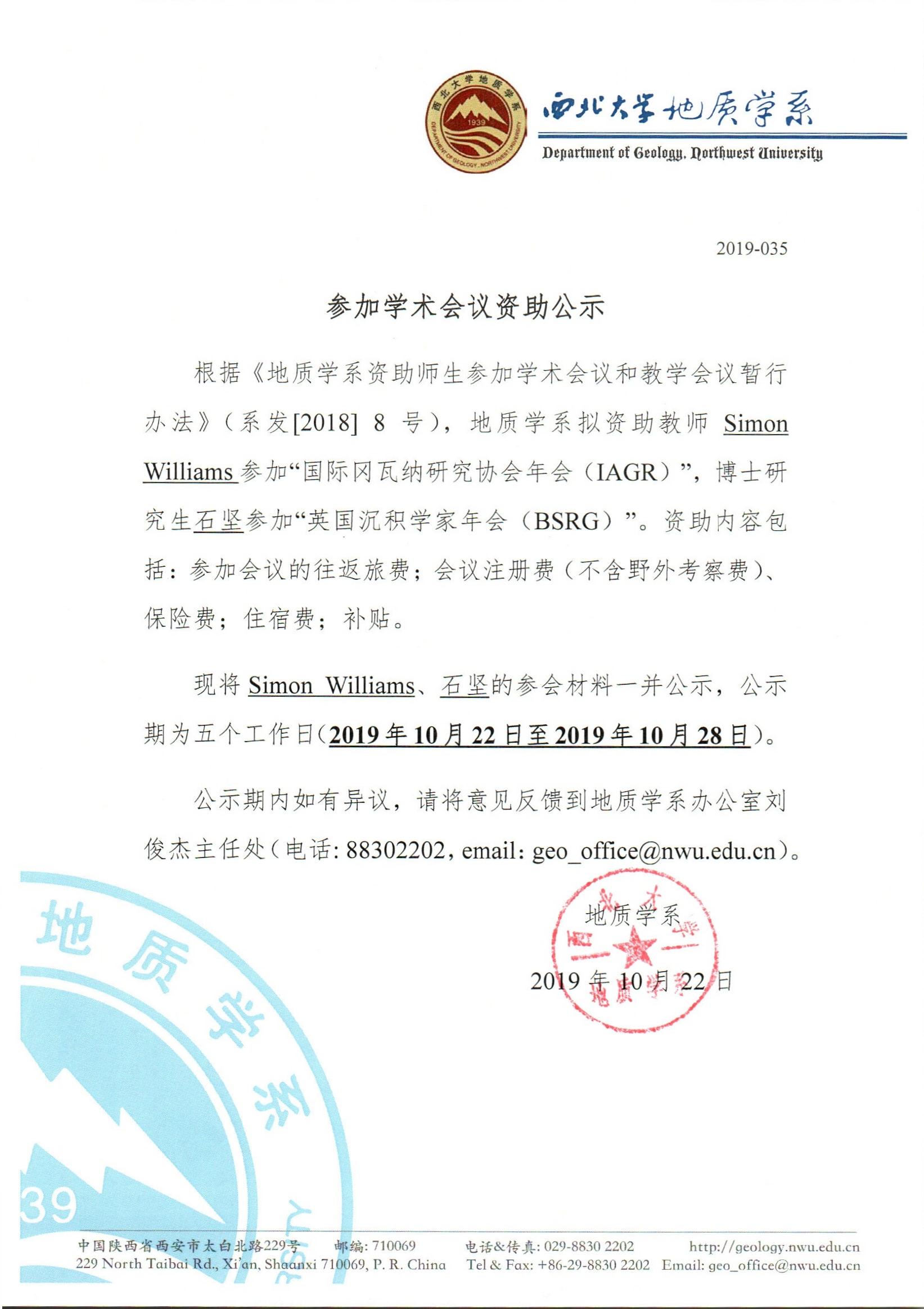 地质学系关于资助教师Simon Williams、博士生石坚出国参加学术会议的公示