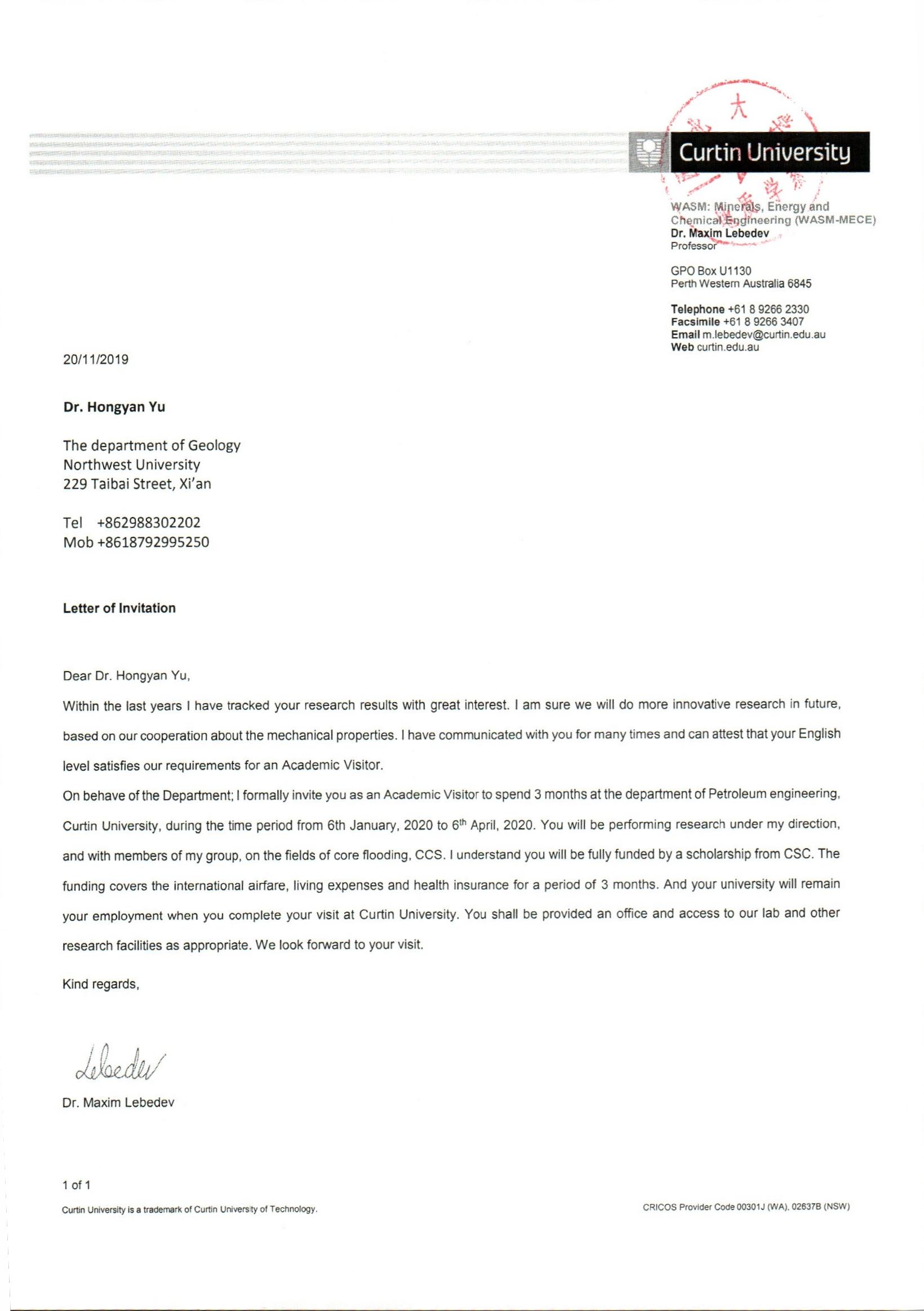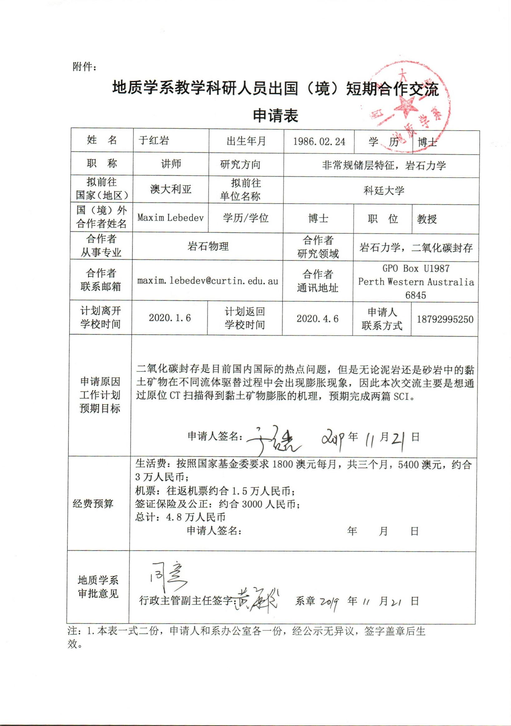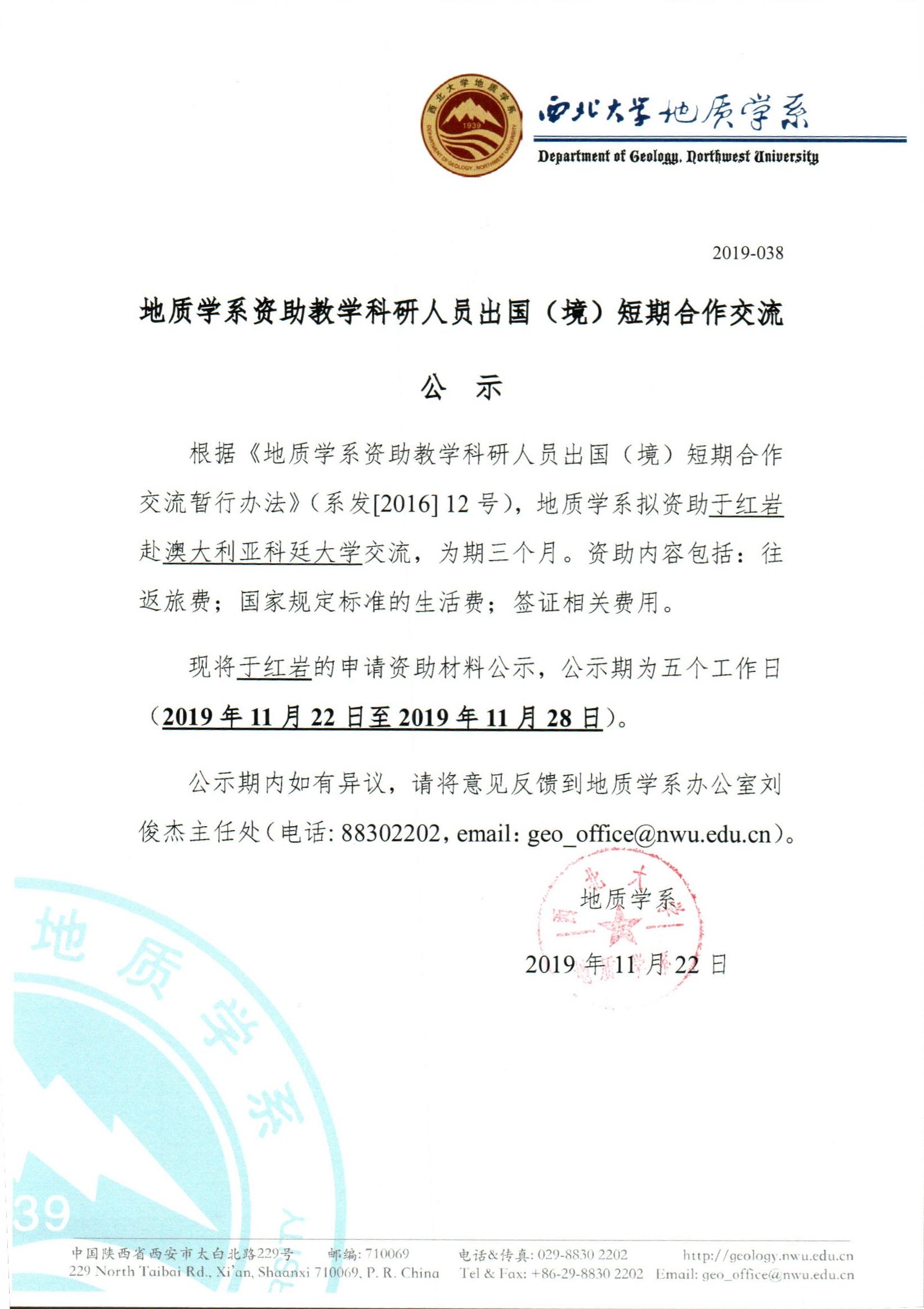 地质学系关于资助教师于红岩出国短期合作交流的公示