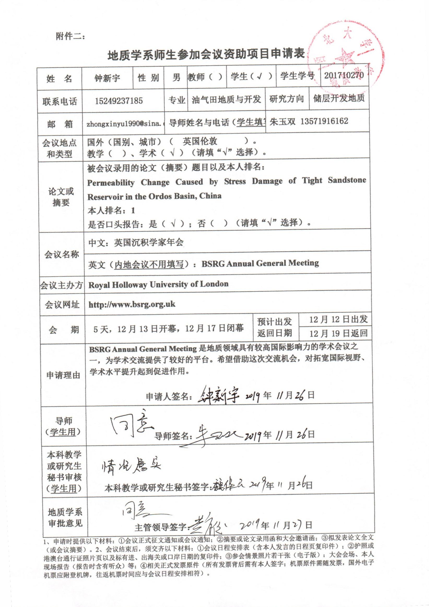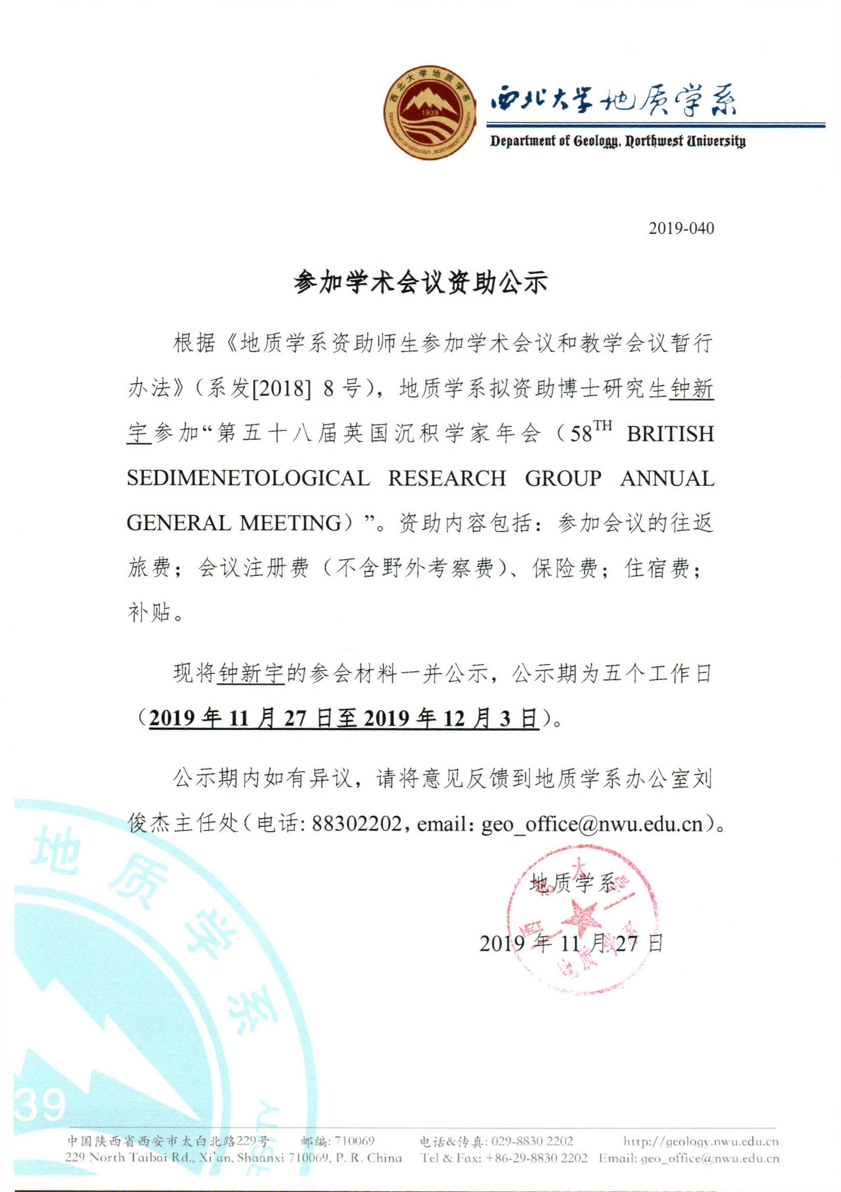 地质学系关于资助博士研究生钟新宇出国参加学术会议的公示