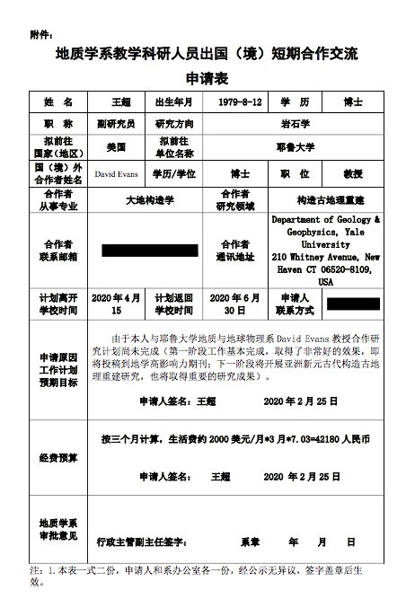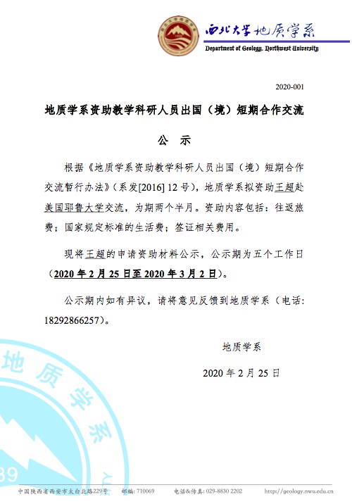 地质学系关于资助教师王超出国短期合作交流的公示