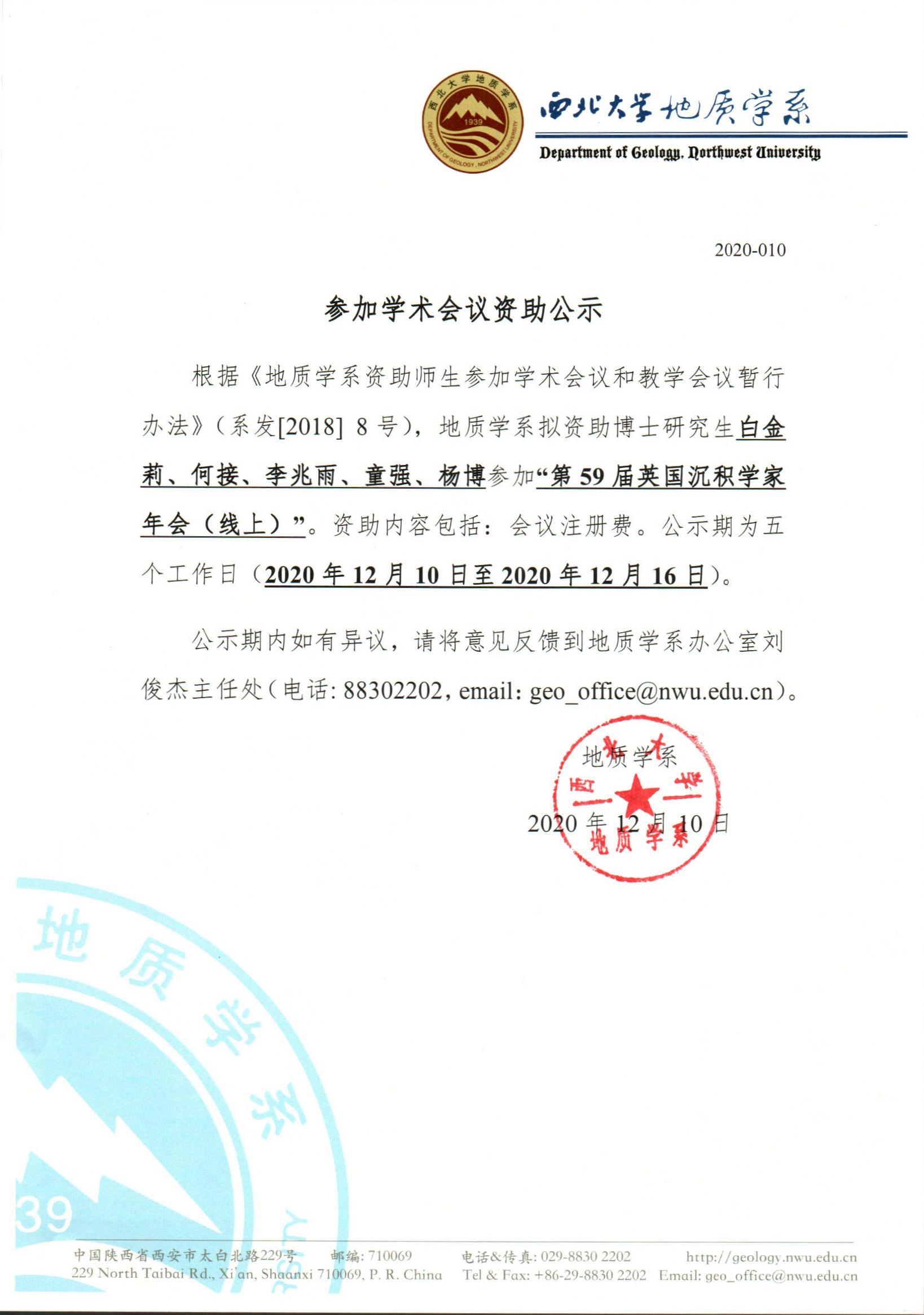 地质学系关于资助博士生白金莉等五人参加国际会议(线上)的公示