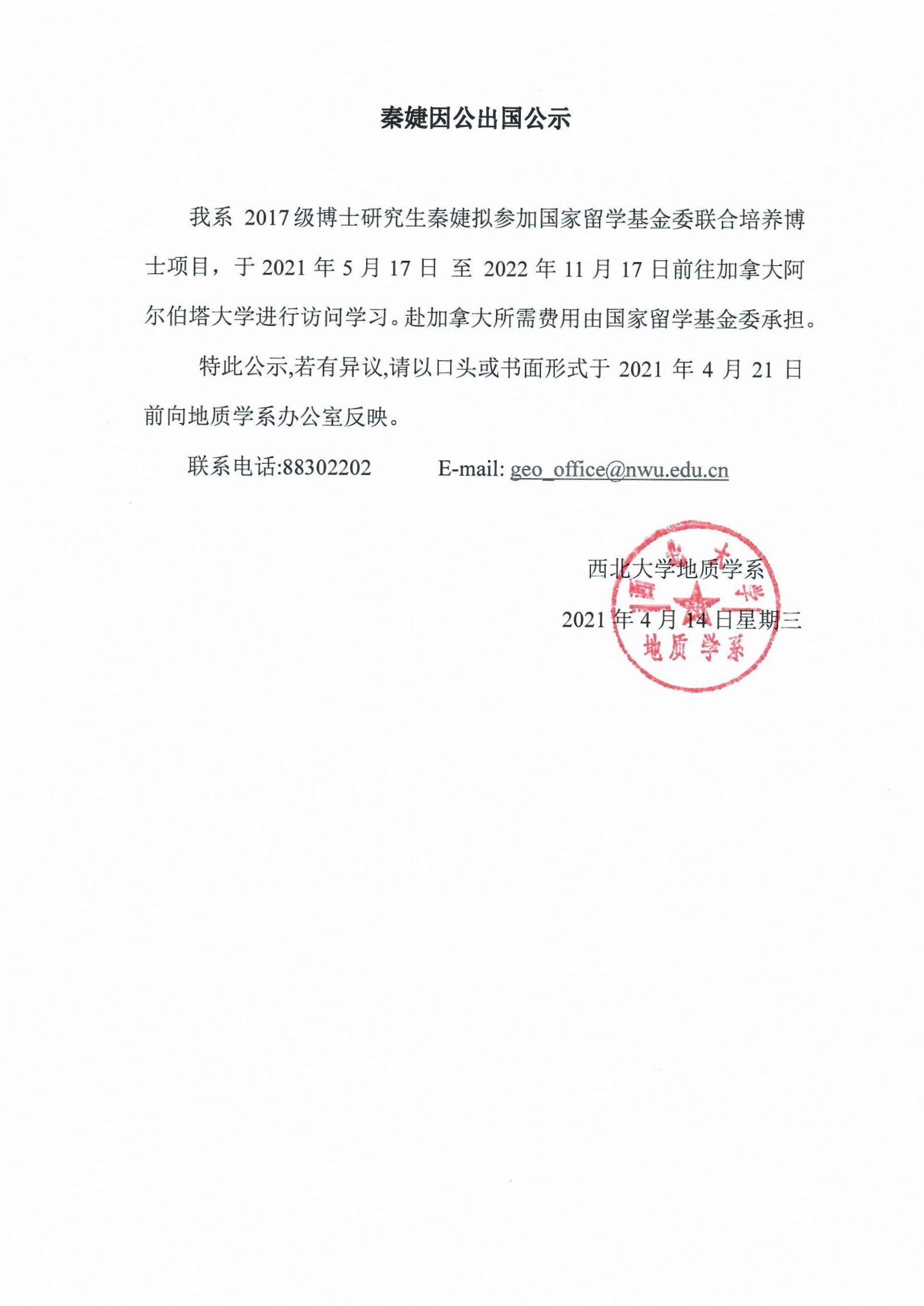 秦婕因公出国公示