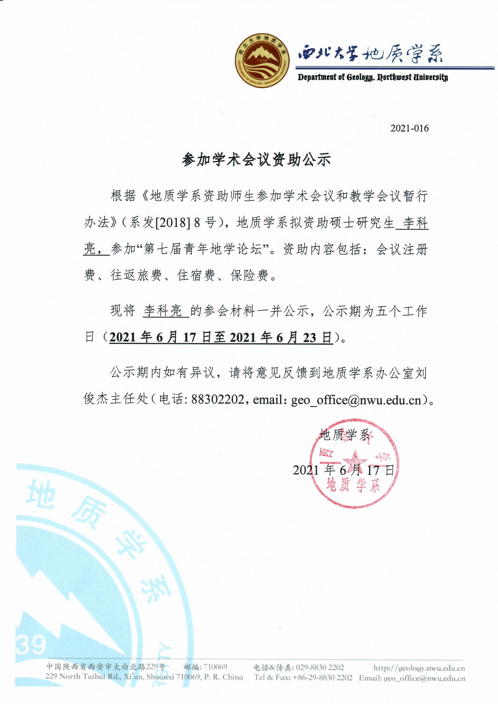 地质学系关于资助硕士生李科亮参加国内会议的公示