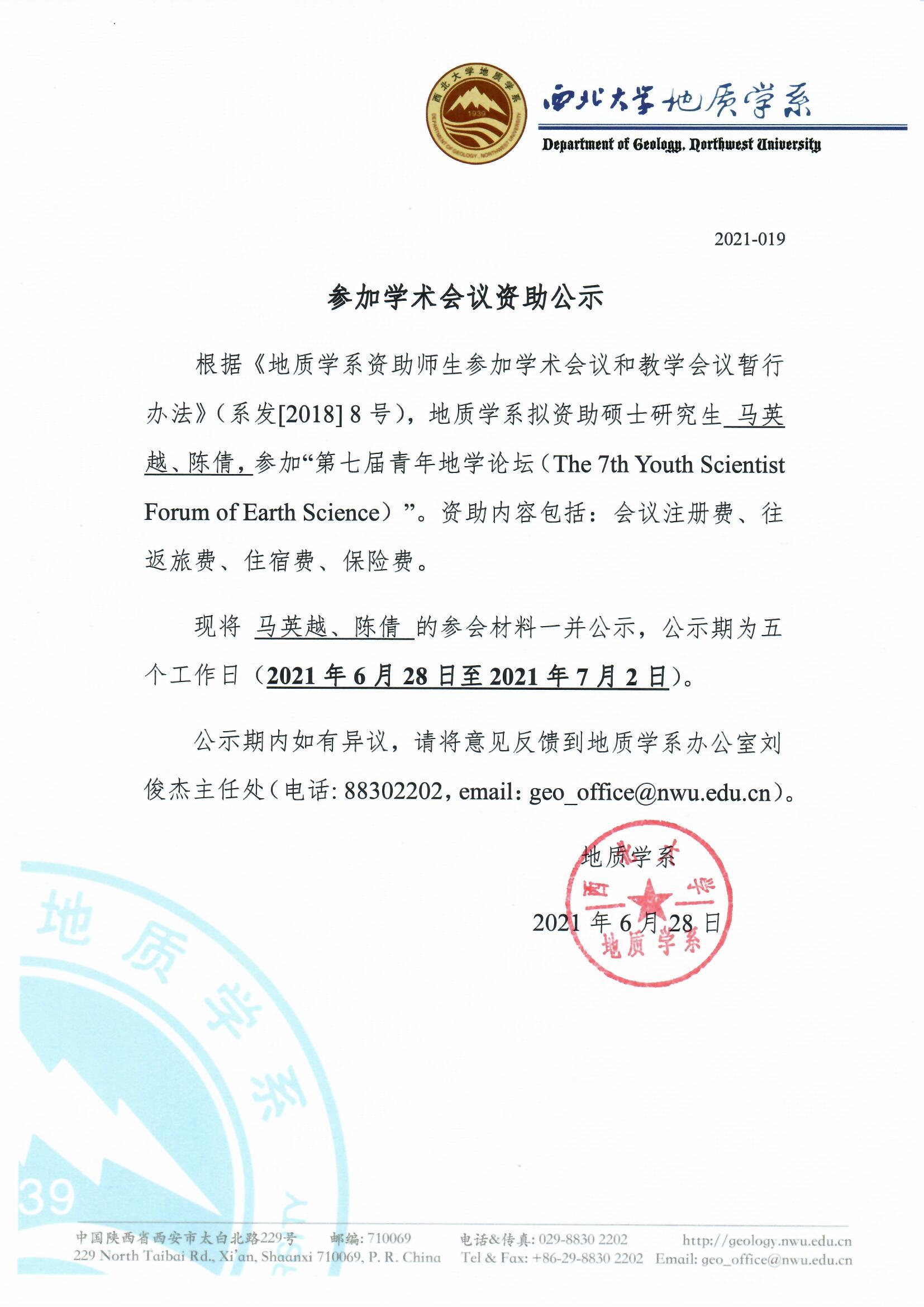 地质学系关于资助硕士生马英越、陈倩参加国内会议的公示