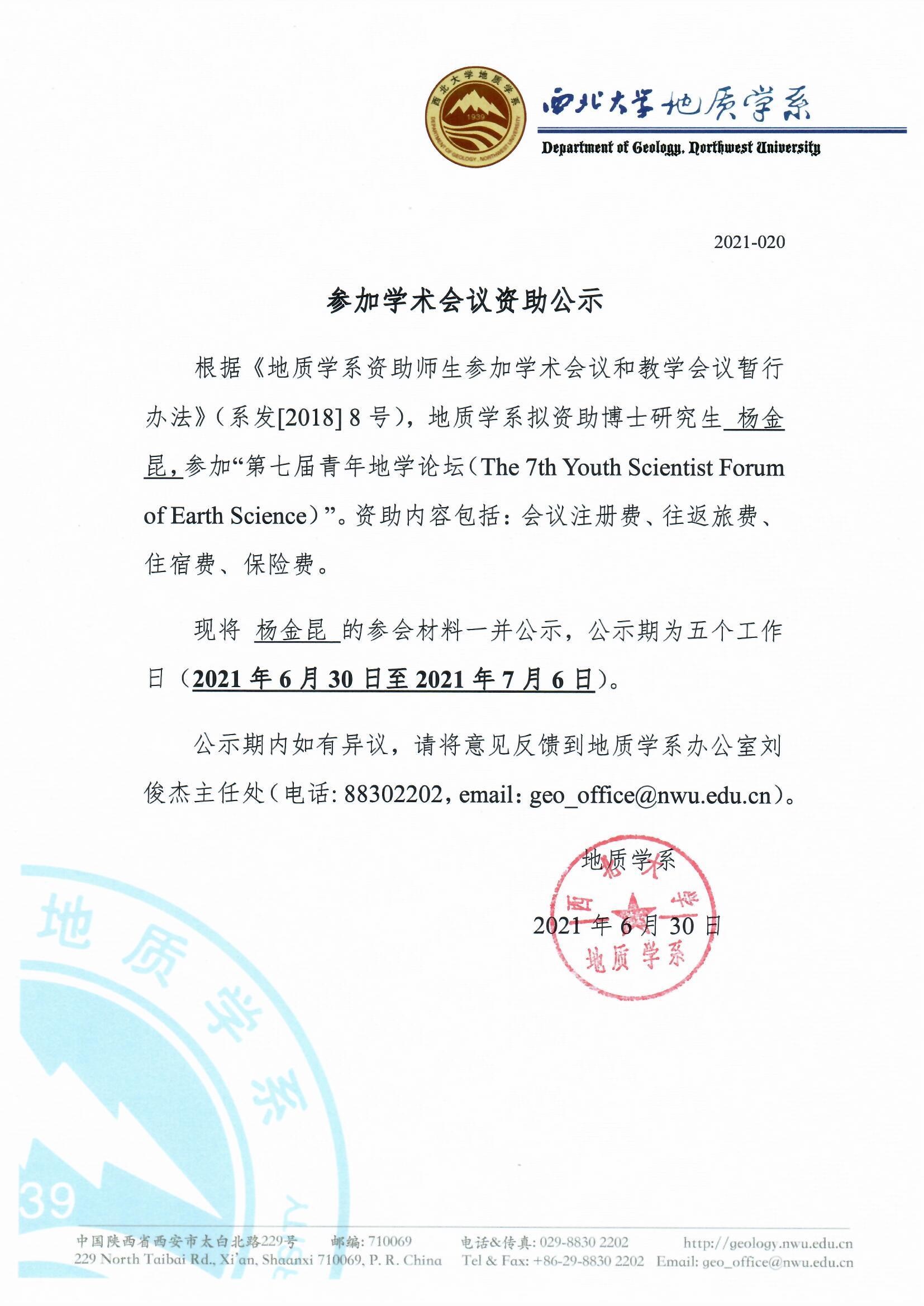 地质学系关于资助博士生杨金昆参加国内会议的公示