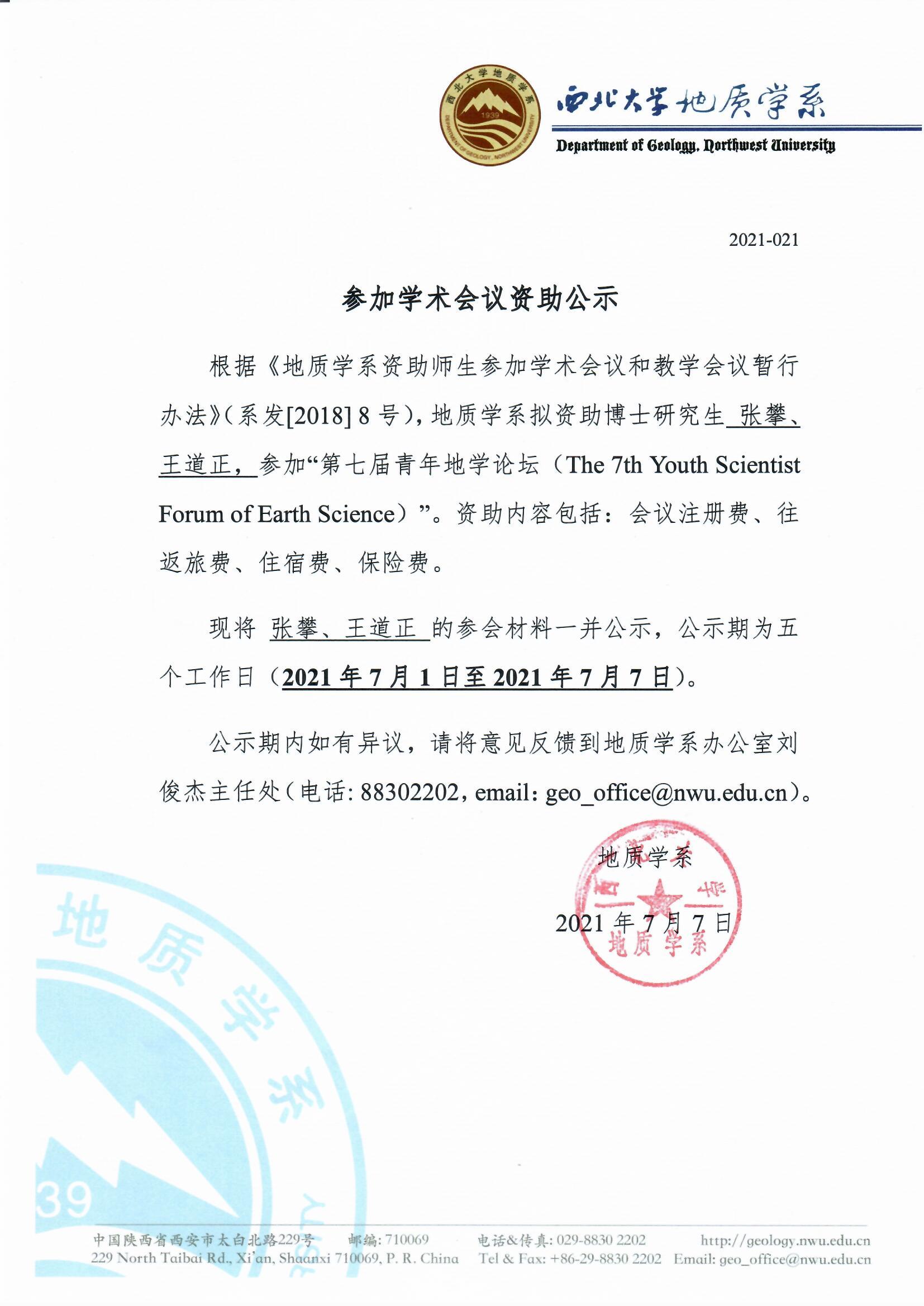 地质学系关于资助博士生张攀、王道正参加国内会议的公示