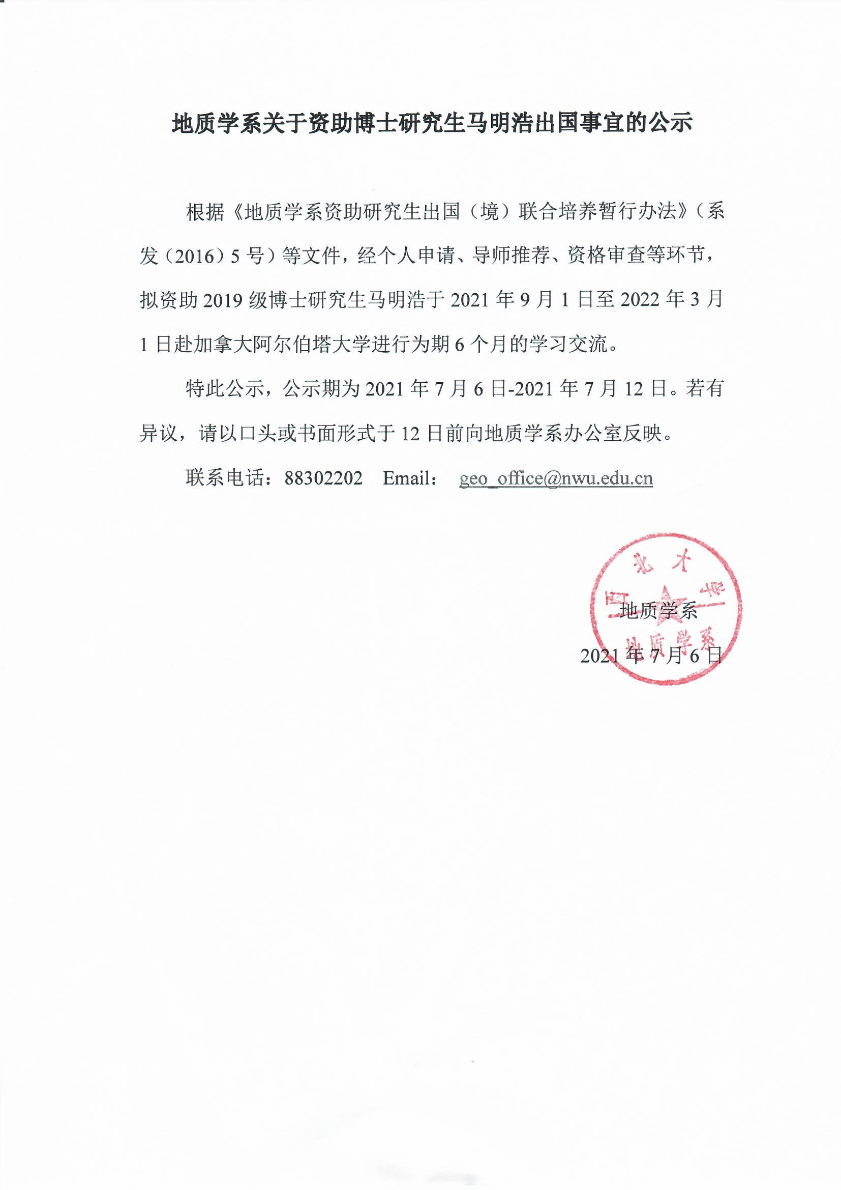 地质学系关于资助博士研究生马明浩出国事宜的公示