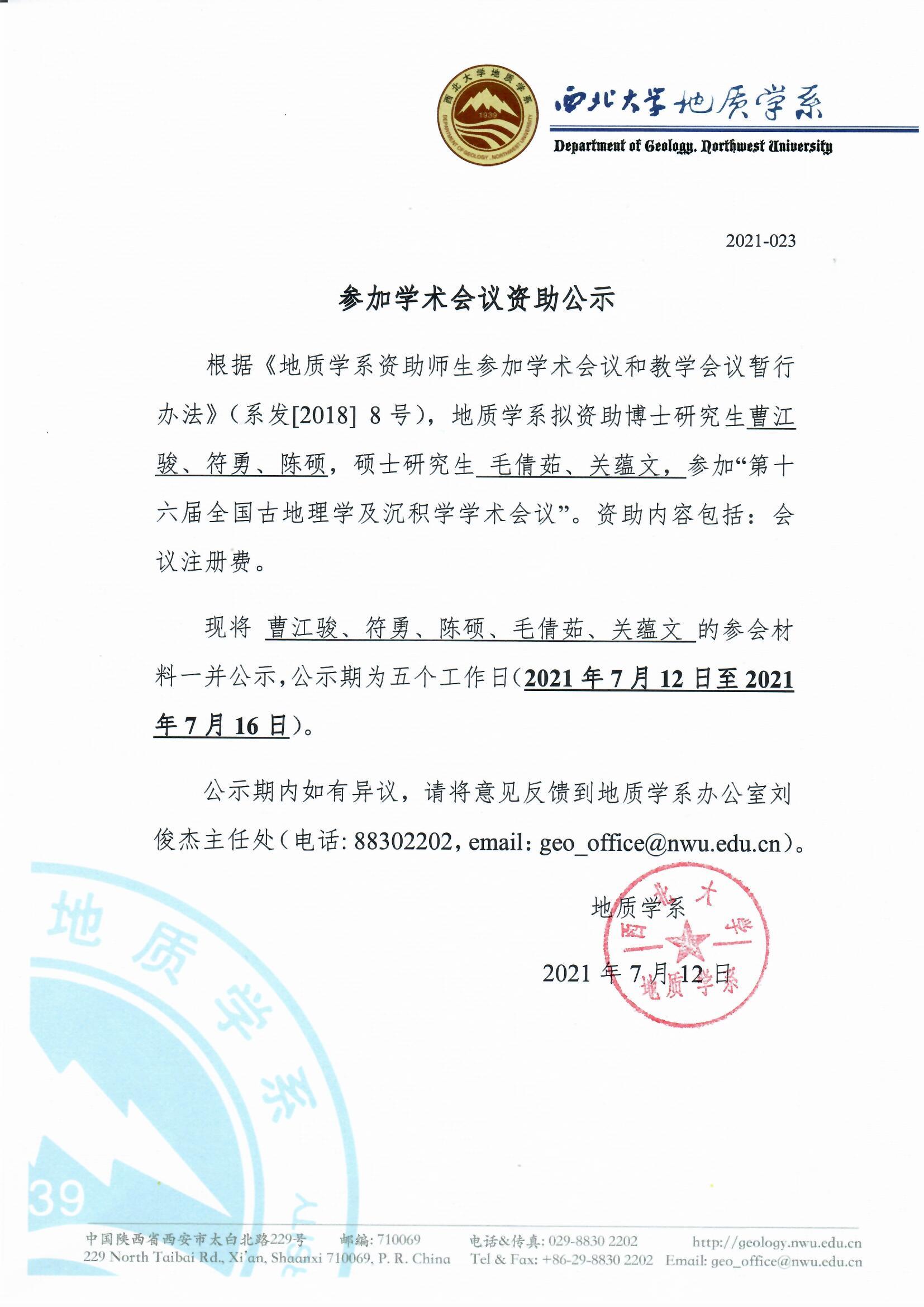 地质学系关于资助博士研究生曹江骏、符勇、陈硕,硕士研究生毛倩茹、关蕴文参加国内会议的公示