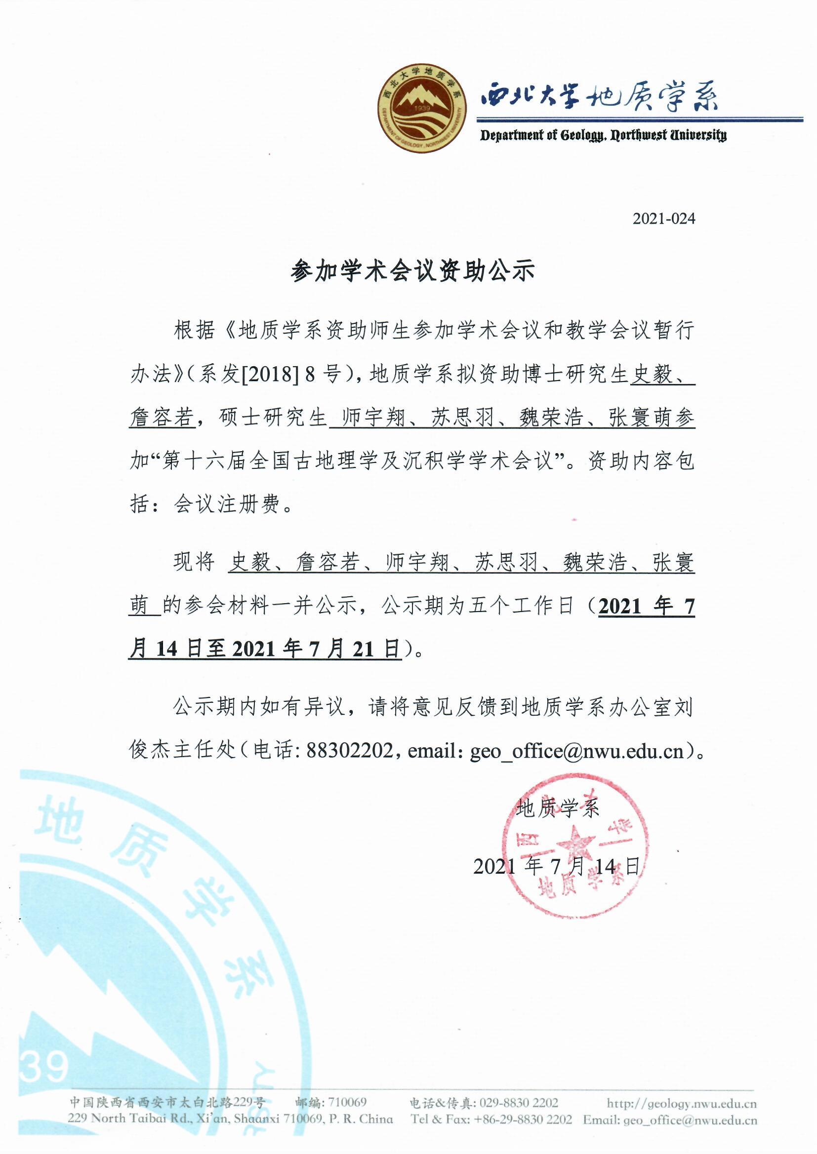 地质学系关于资助博士研究生史毅等,硕士研究生师宇翔等人参加国内会议的公示