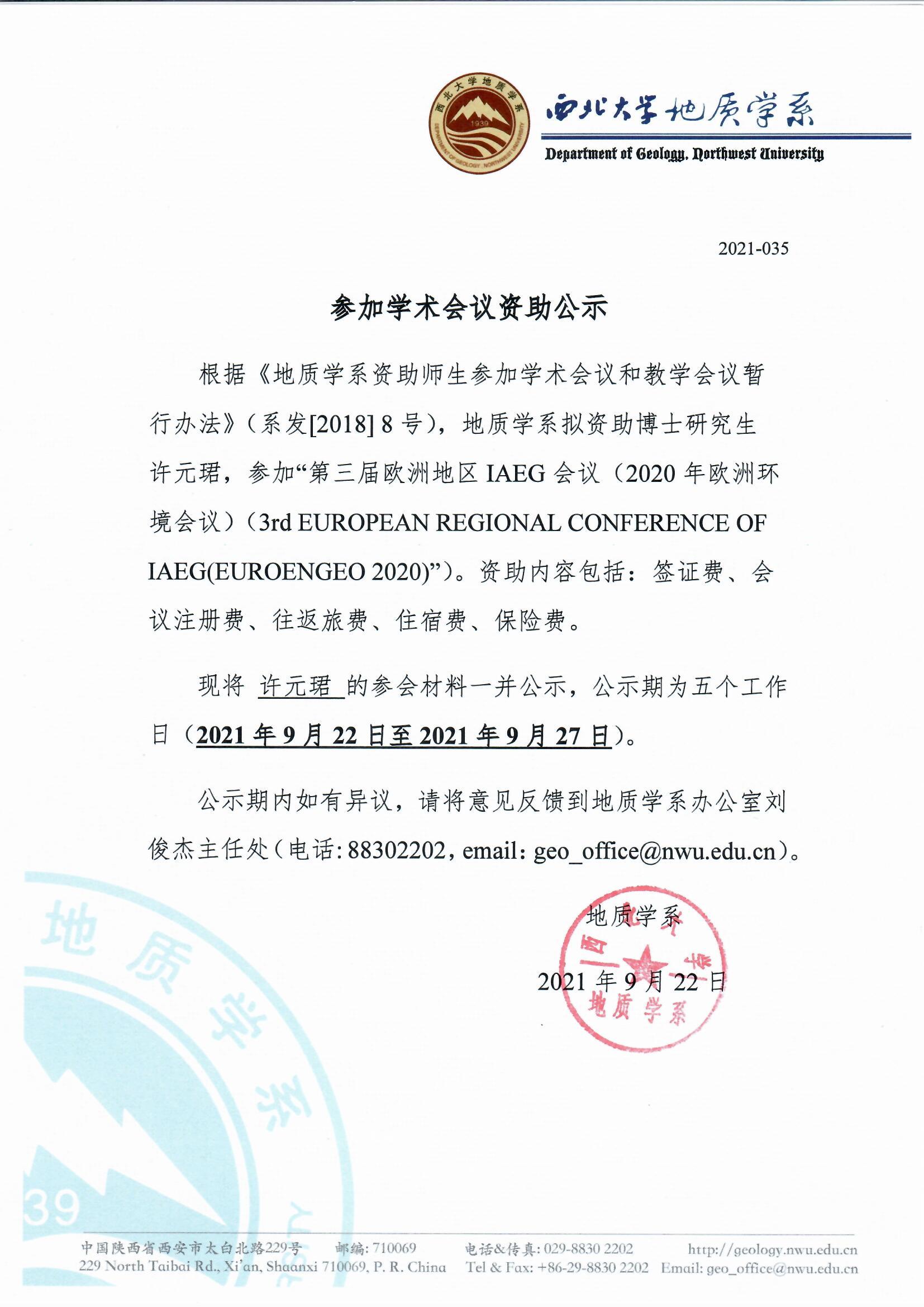 地质学系关于资助博士研究生许元珺参加国际会议的公示