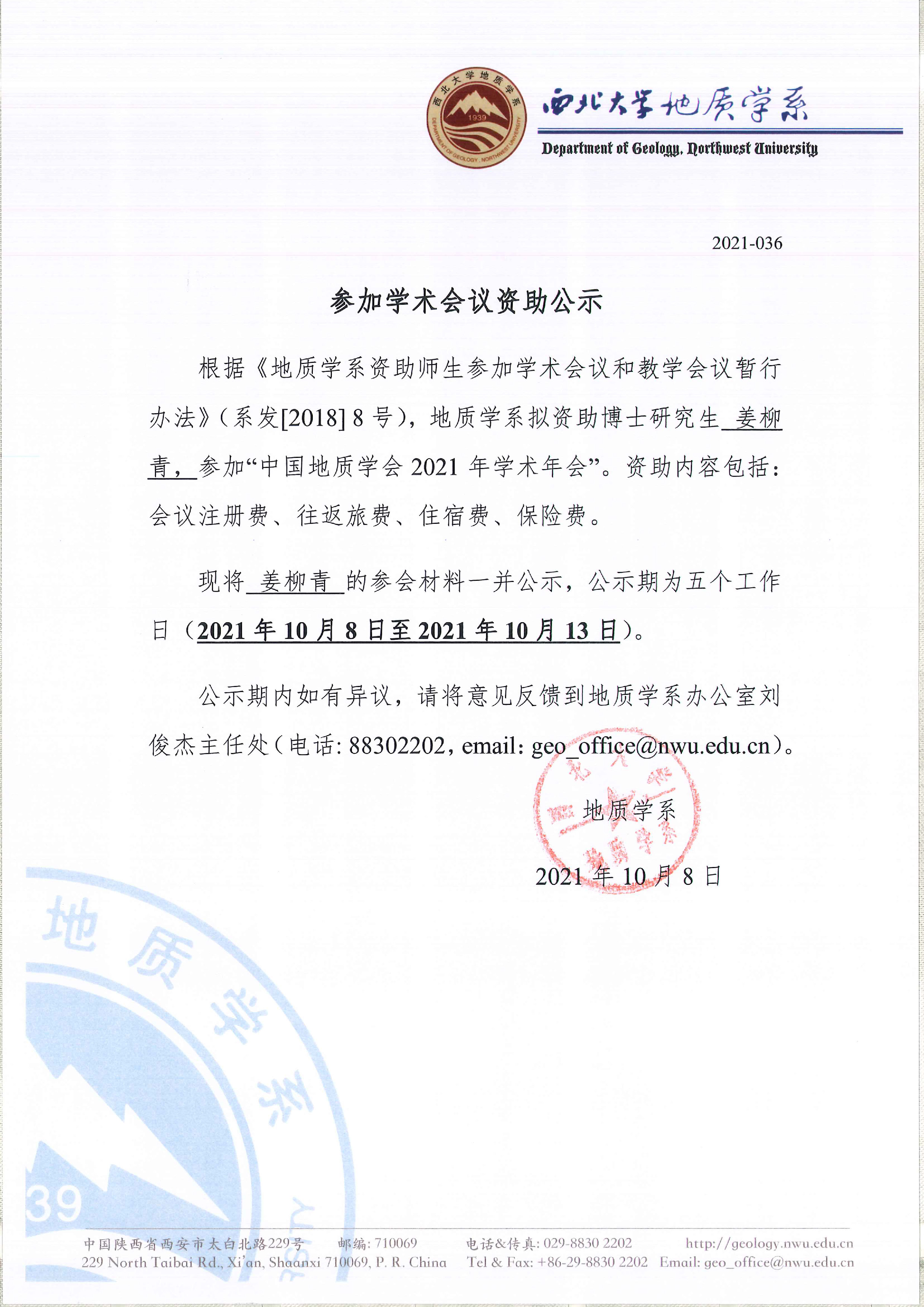 地质学系关于资助博士研究生姜柳青参加国内会议的公示