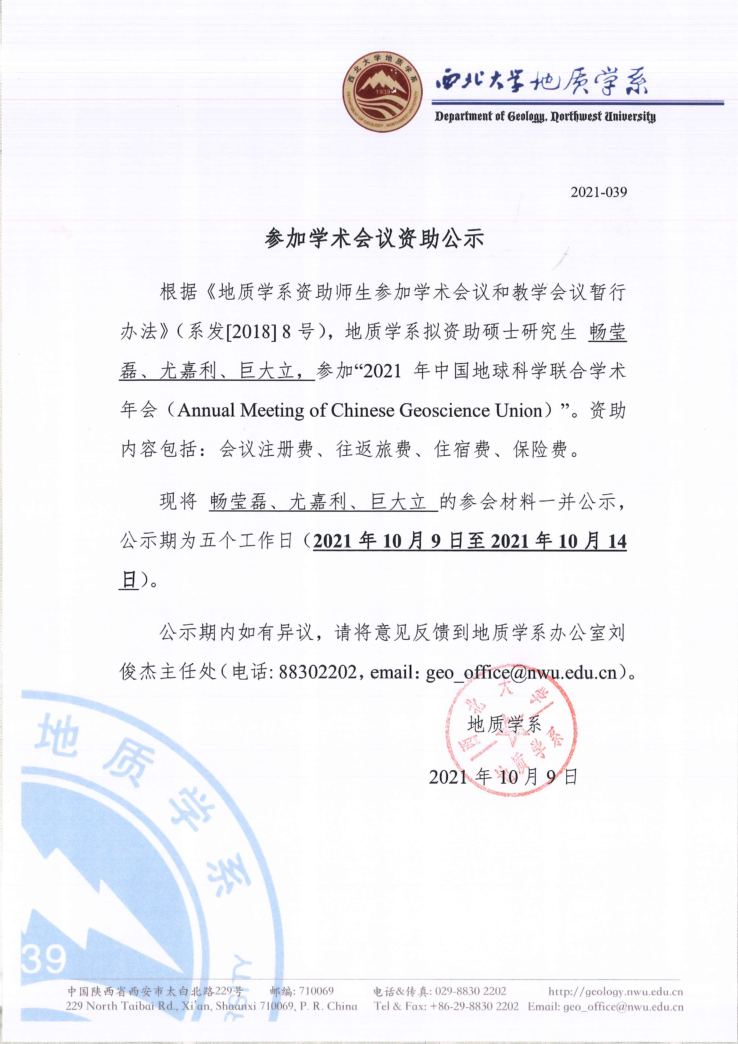 地质学系关于资助硕士研究生畅莹磊等参加国内会议的公示