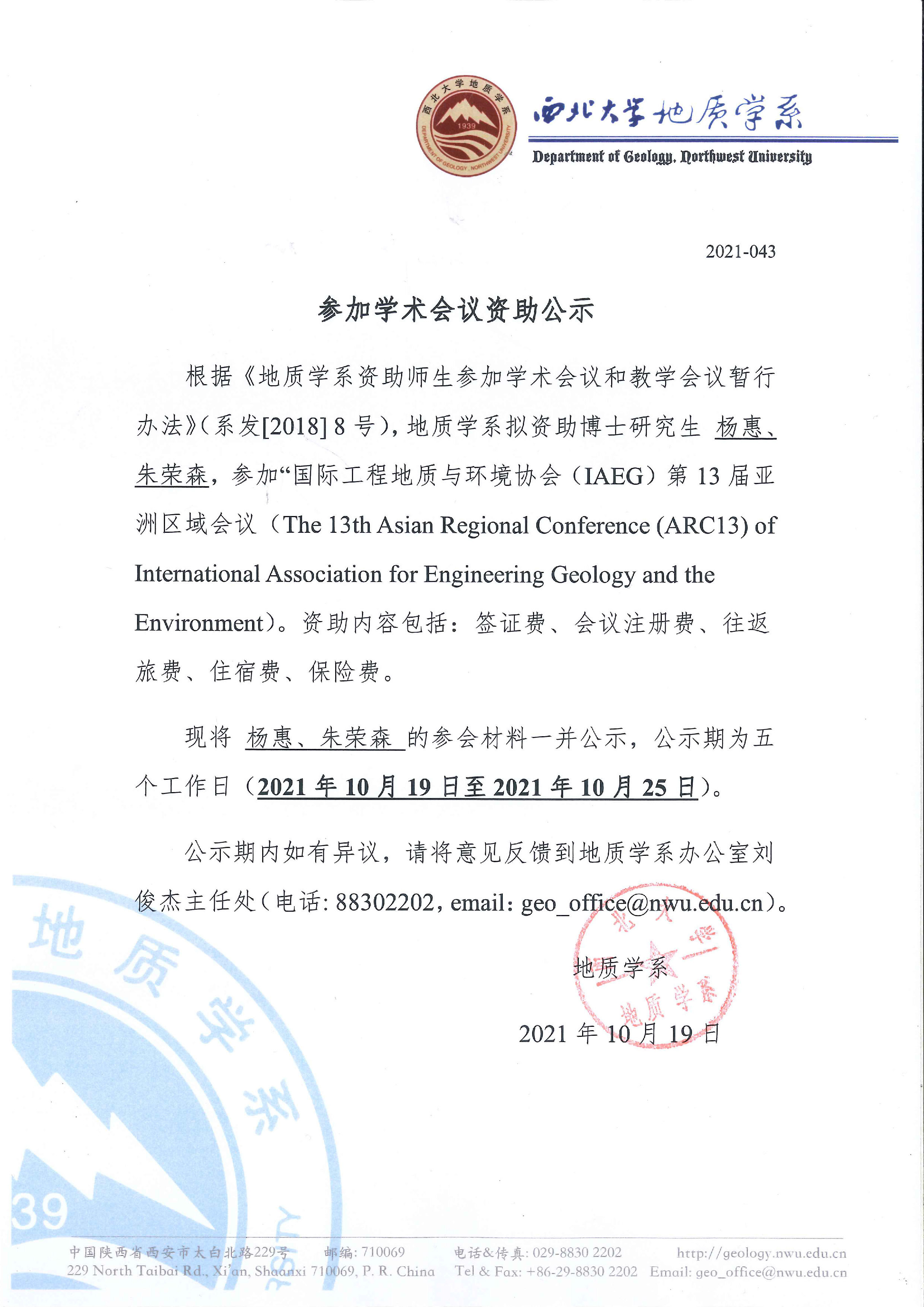 地质学系关于资助博士研究生杨惠、朱荣森参加国际会议的公示