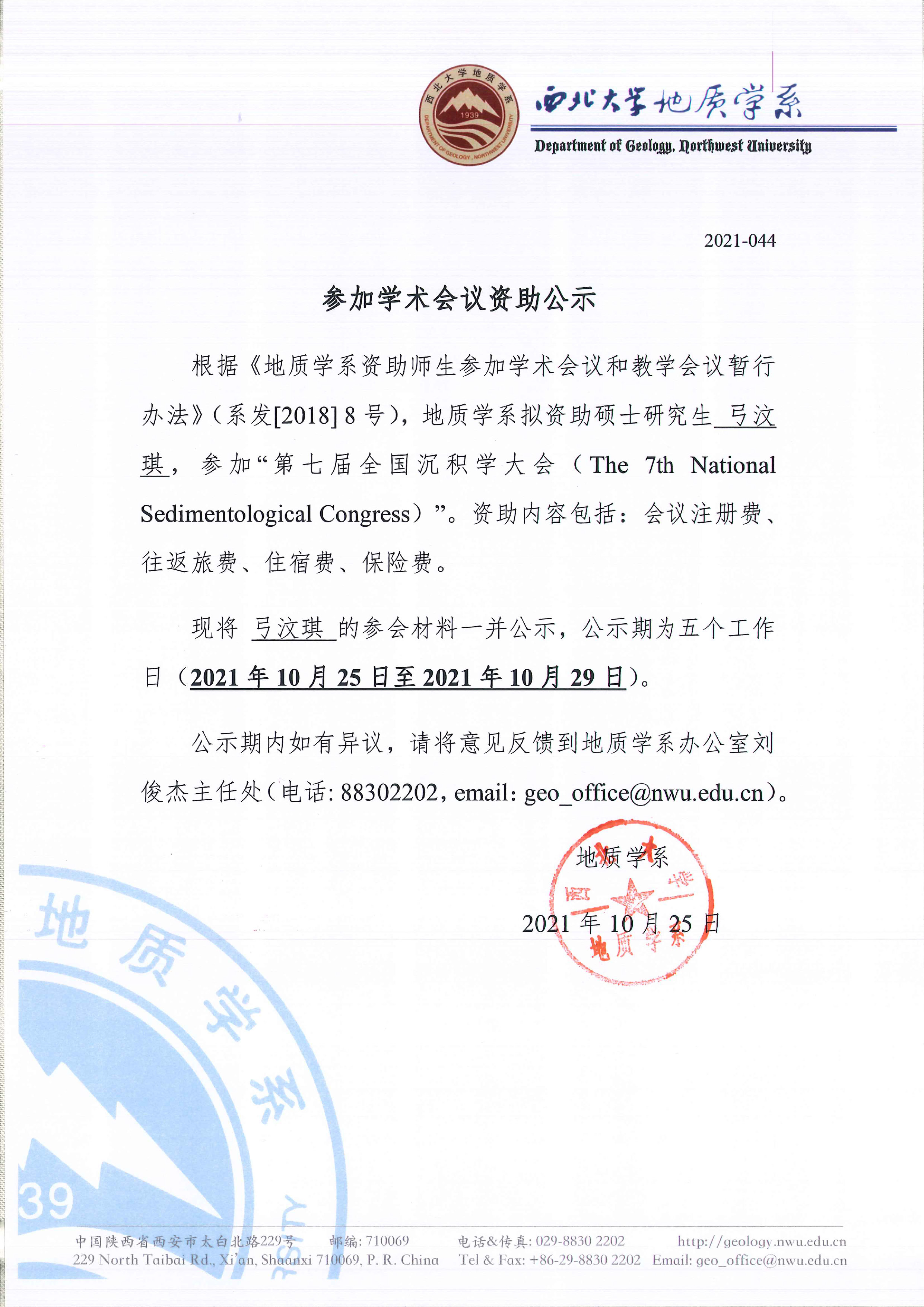 地质学系关于资助硕士研究生弓汶琪参加国内会议的公示