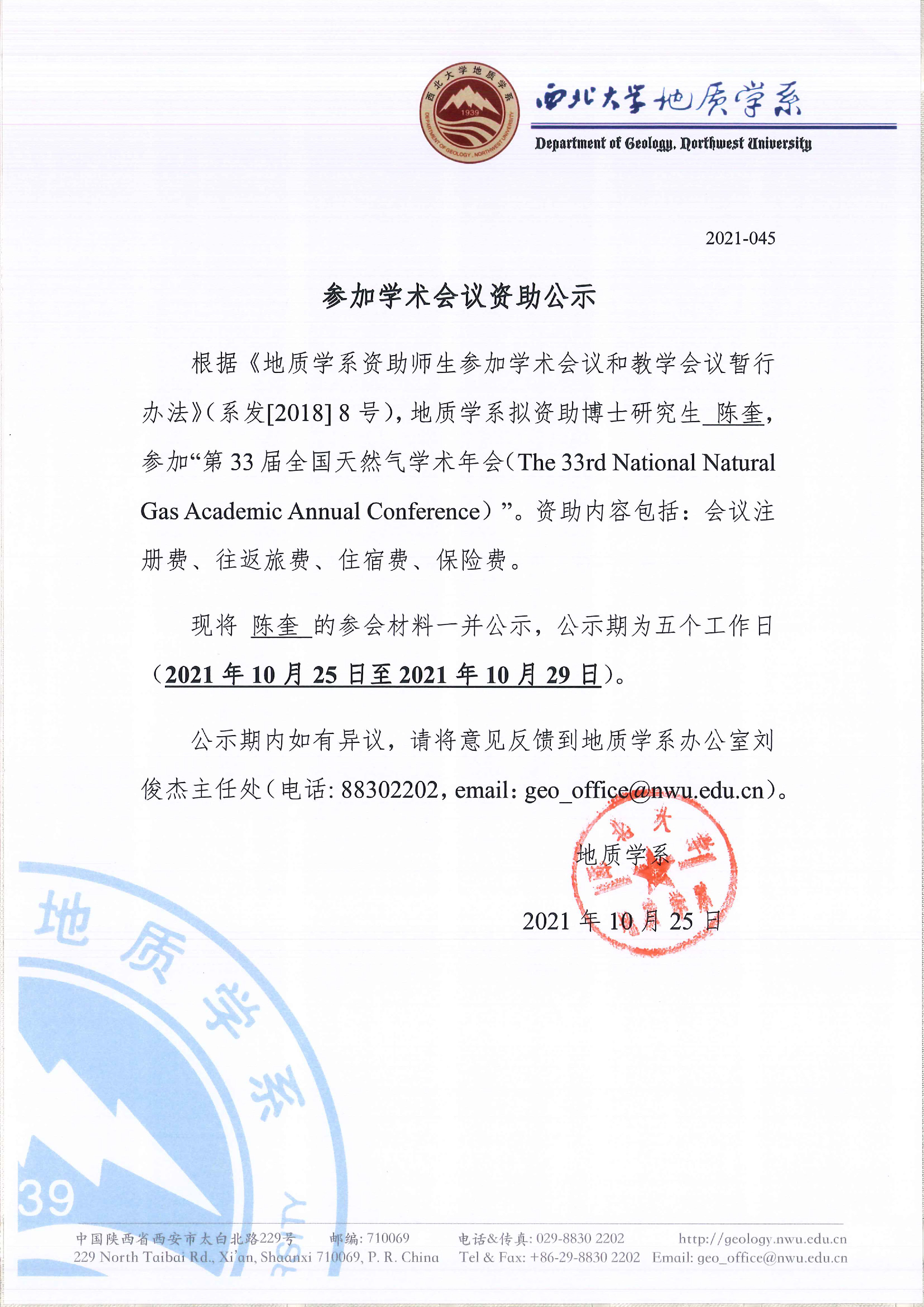 地质学系关于资助博士研究生陈奎参加国内会议的公示