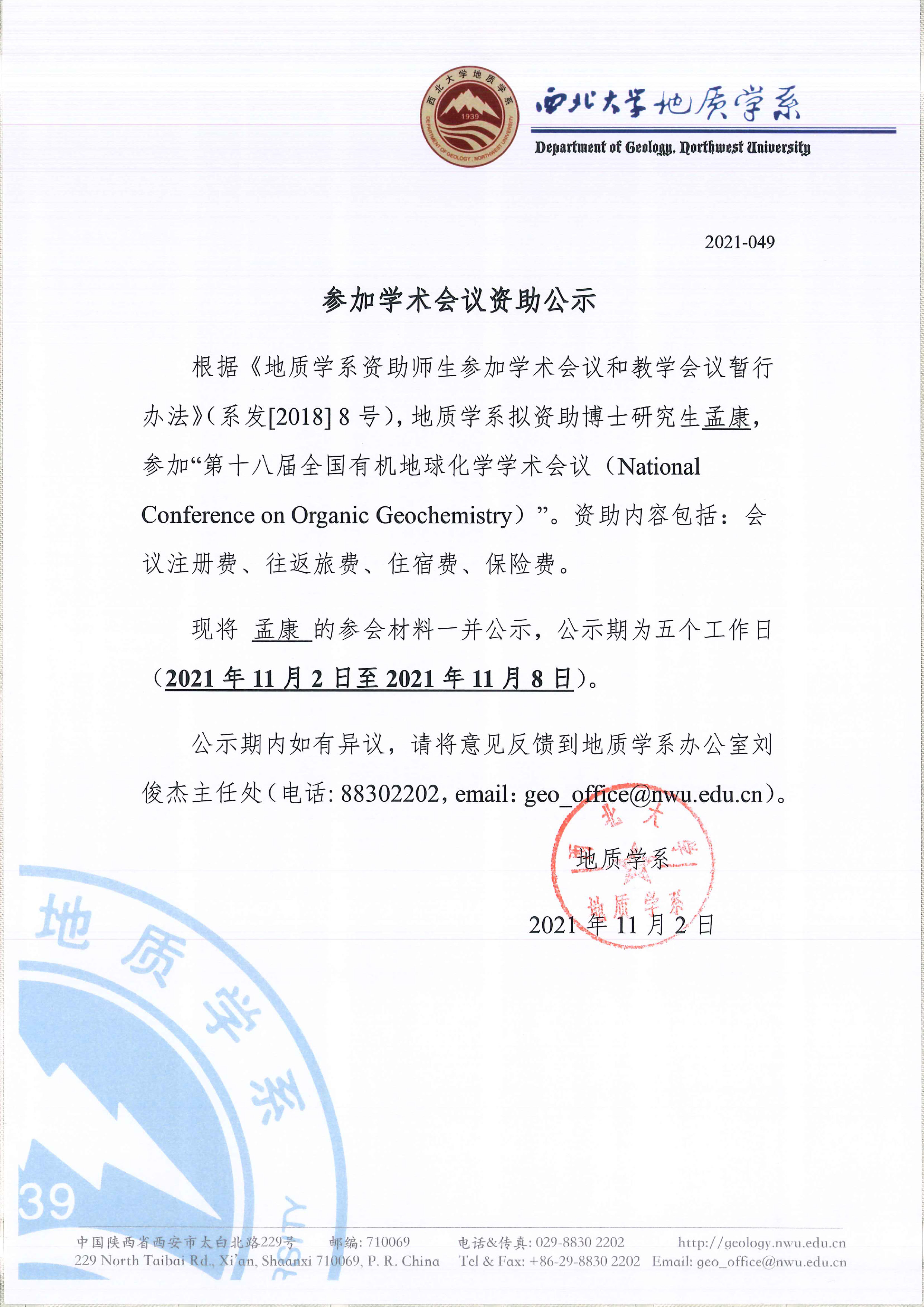 地质学系关于资助博士研究生孟康参加国内会议的公示