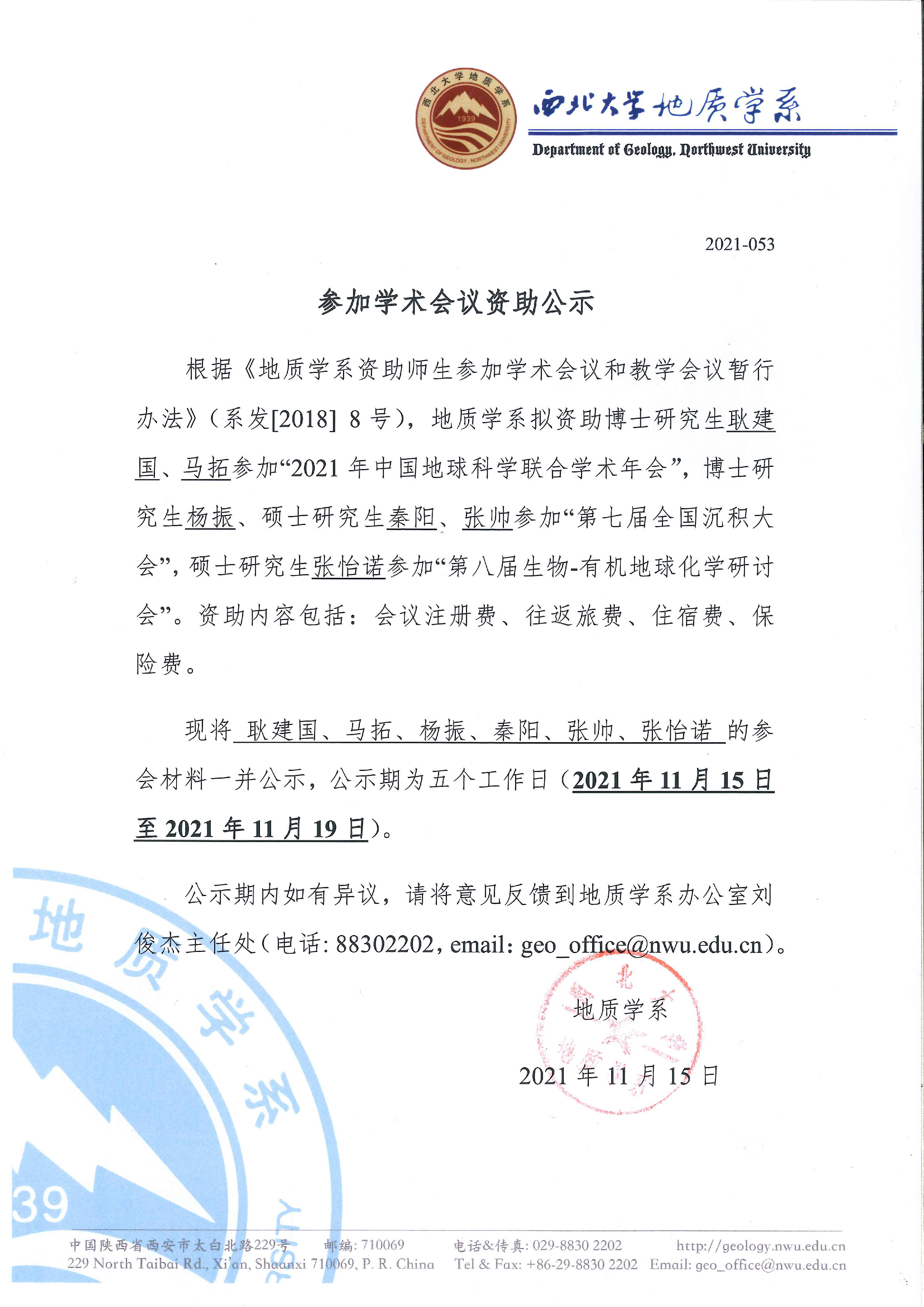地质学系关于资助博士研究生耿建国等6人参加学术会议的公示