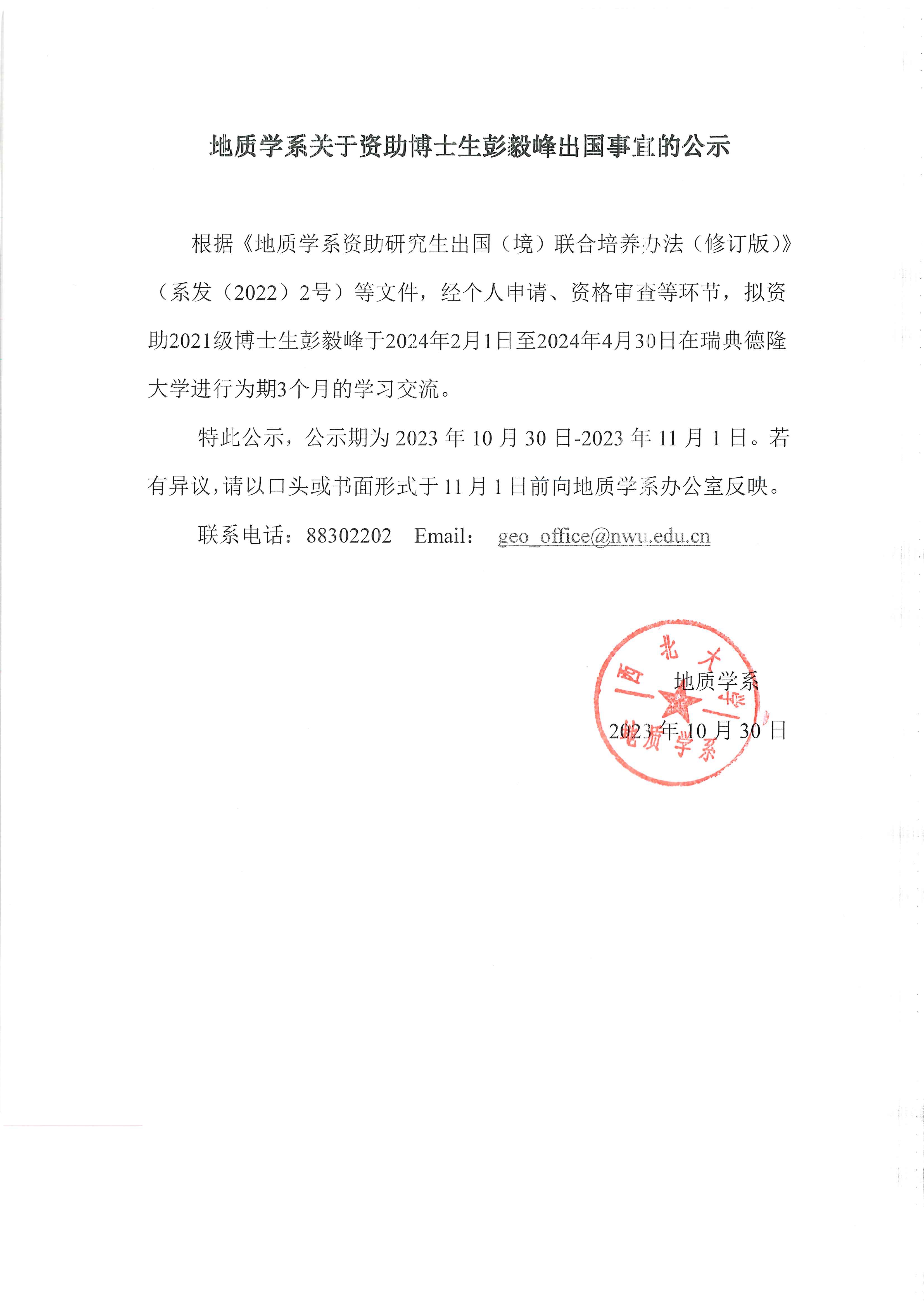 地质学系关于资助博士生彭毅峰出国联合培养的公示
