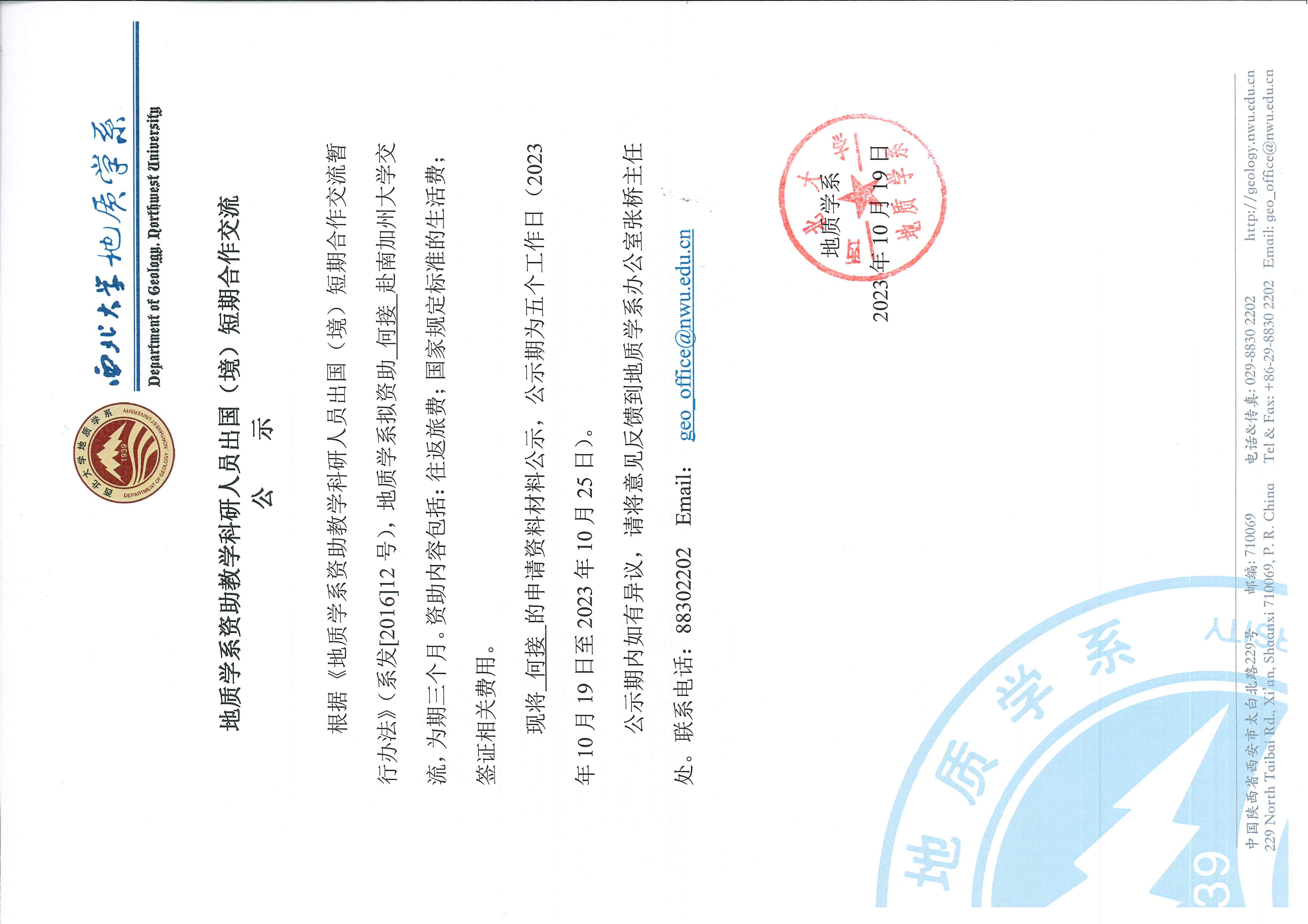 地质学系关于资助博士后何接出国短期合作交流的公示