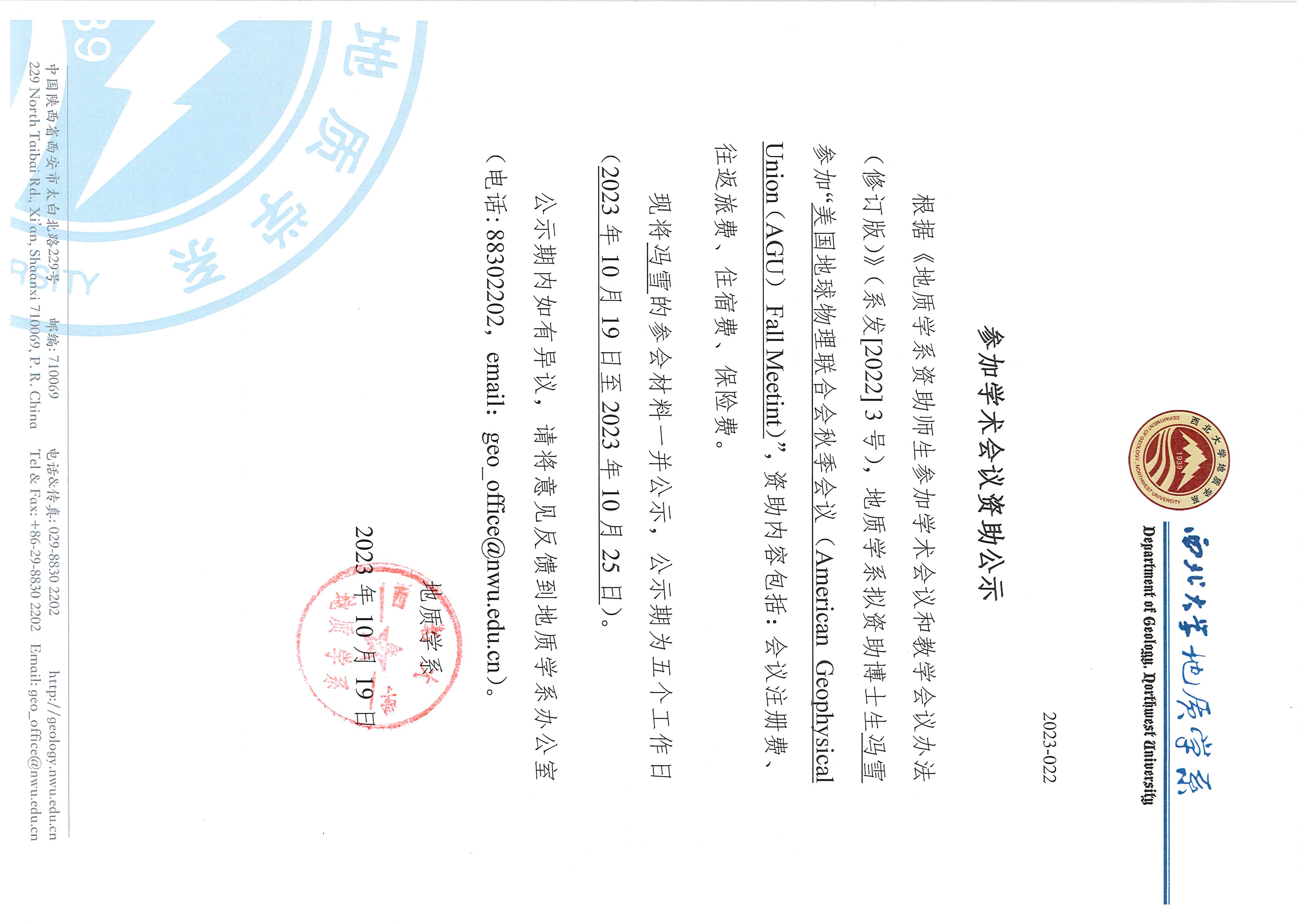 地质学系关于资助博士生冯雪参加国际会议的公示