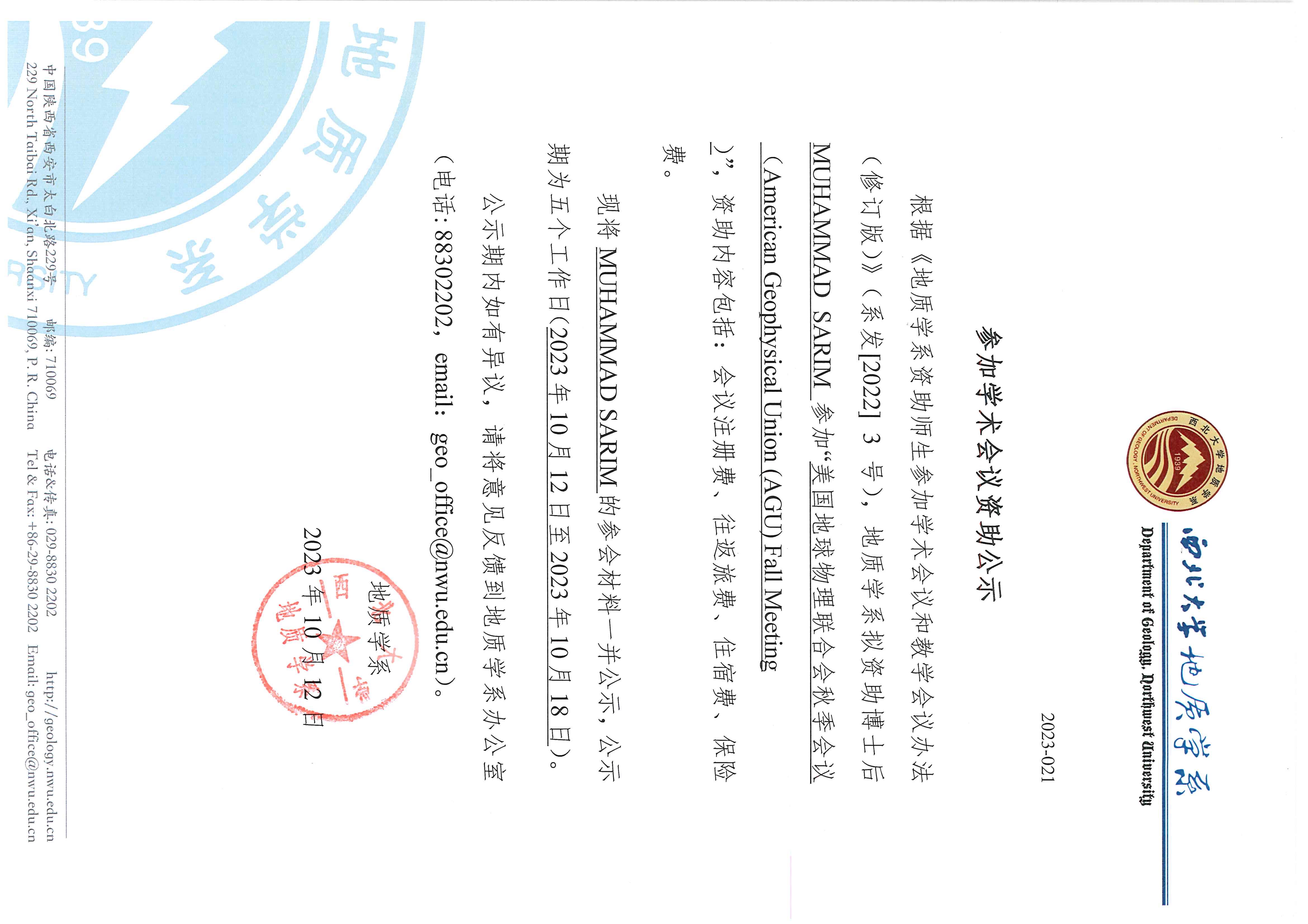 地质学系关于资助博士后MUHAMMAD SARIM参加国际会议的公示