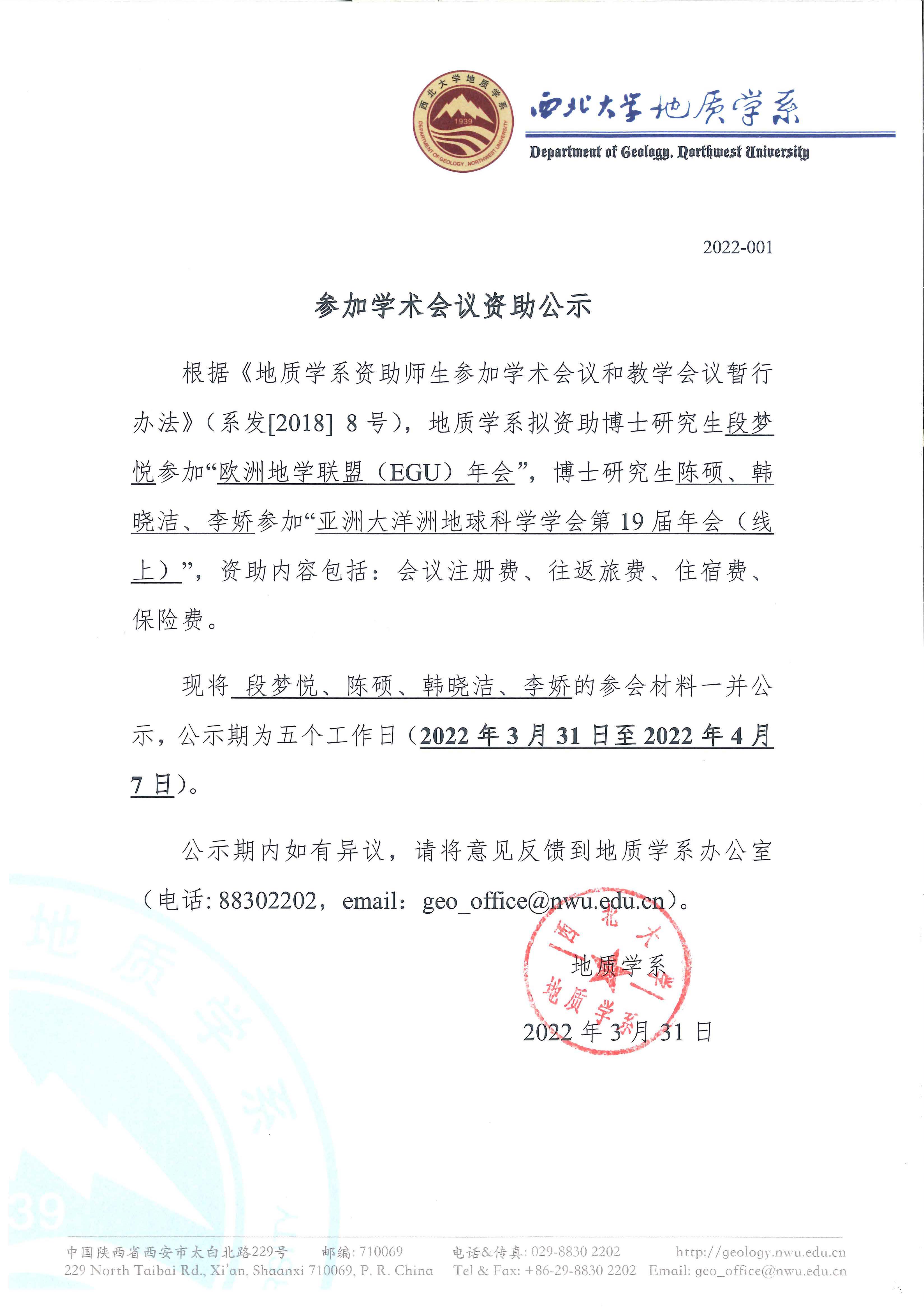 地质学系关于资助博士生段梦悦等四人参加国际会议的公示