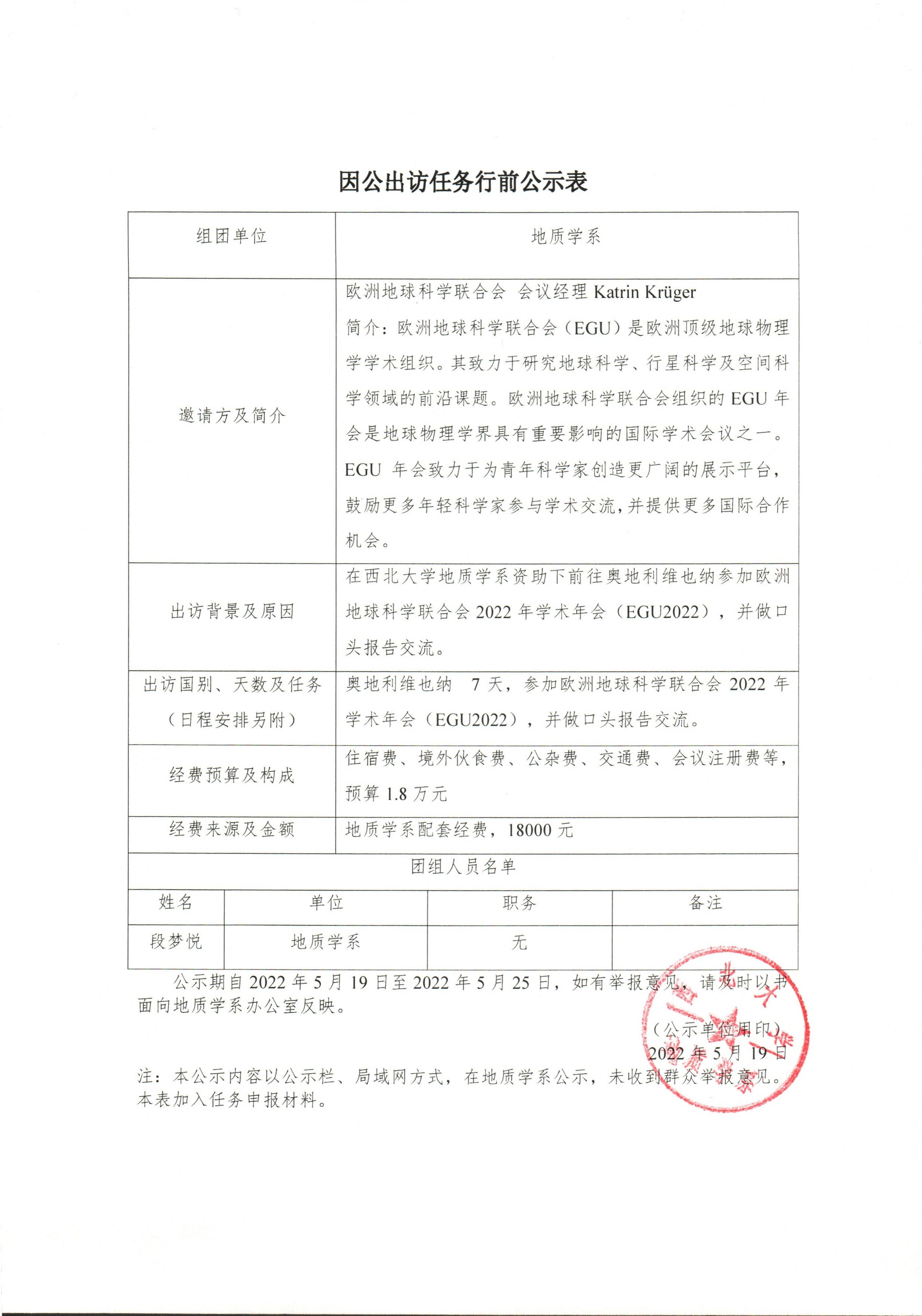 段梦悦因公出访行前公示