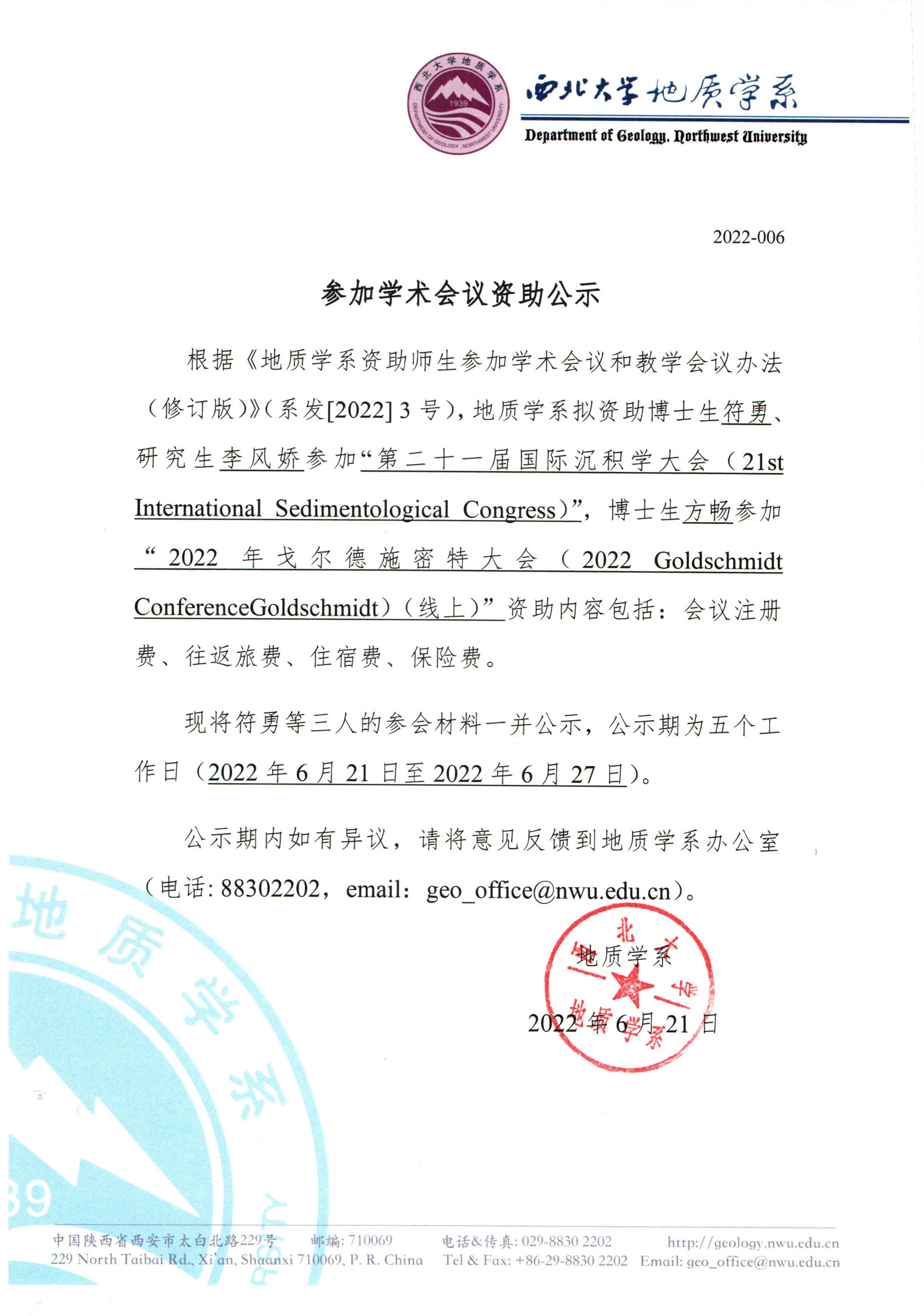 地质学系关于资助博士生符勇等三人参加学术会议的公示