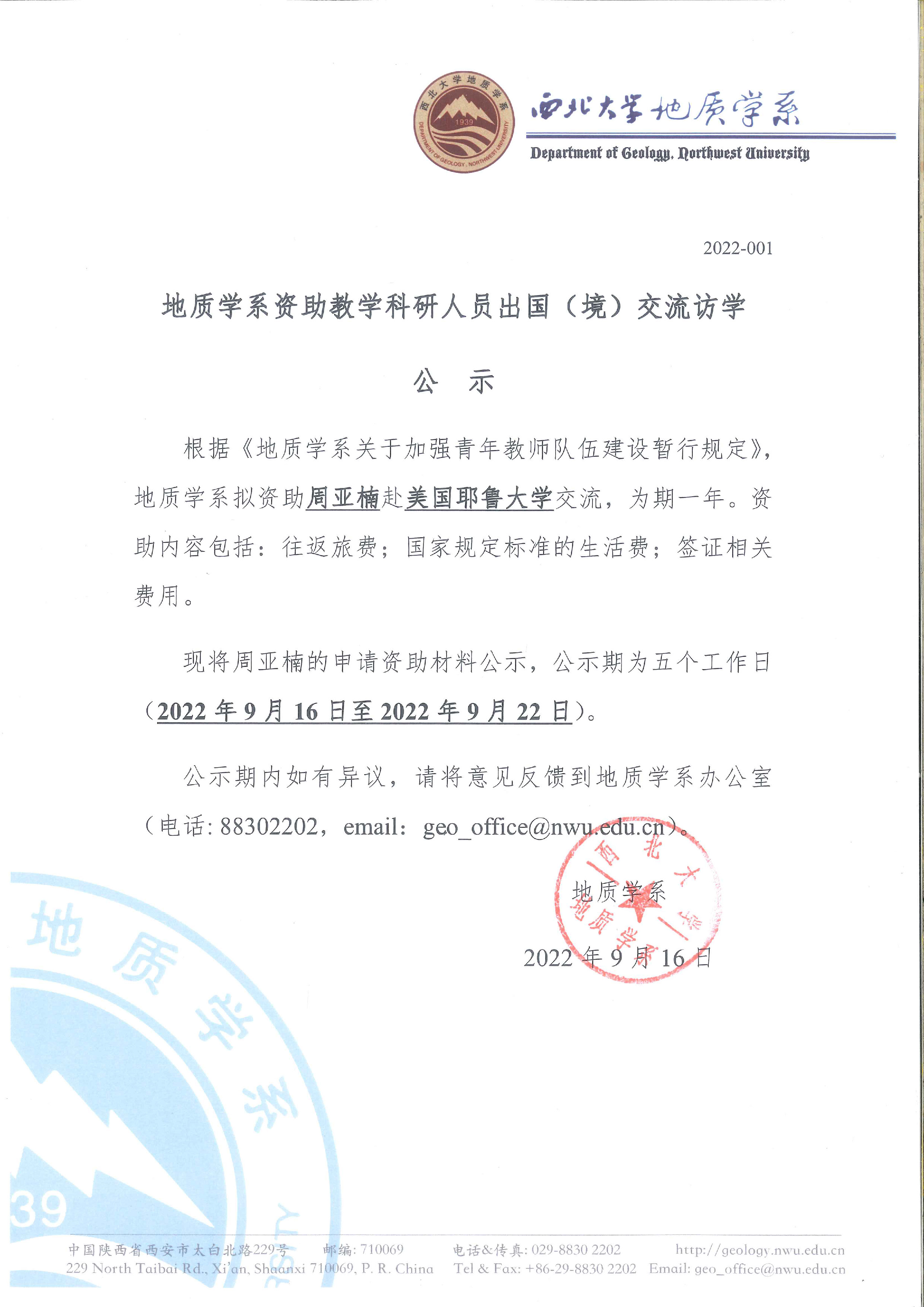 地质学系关于资助教师周亚楠出国交流访学的公示